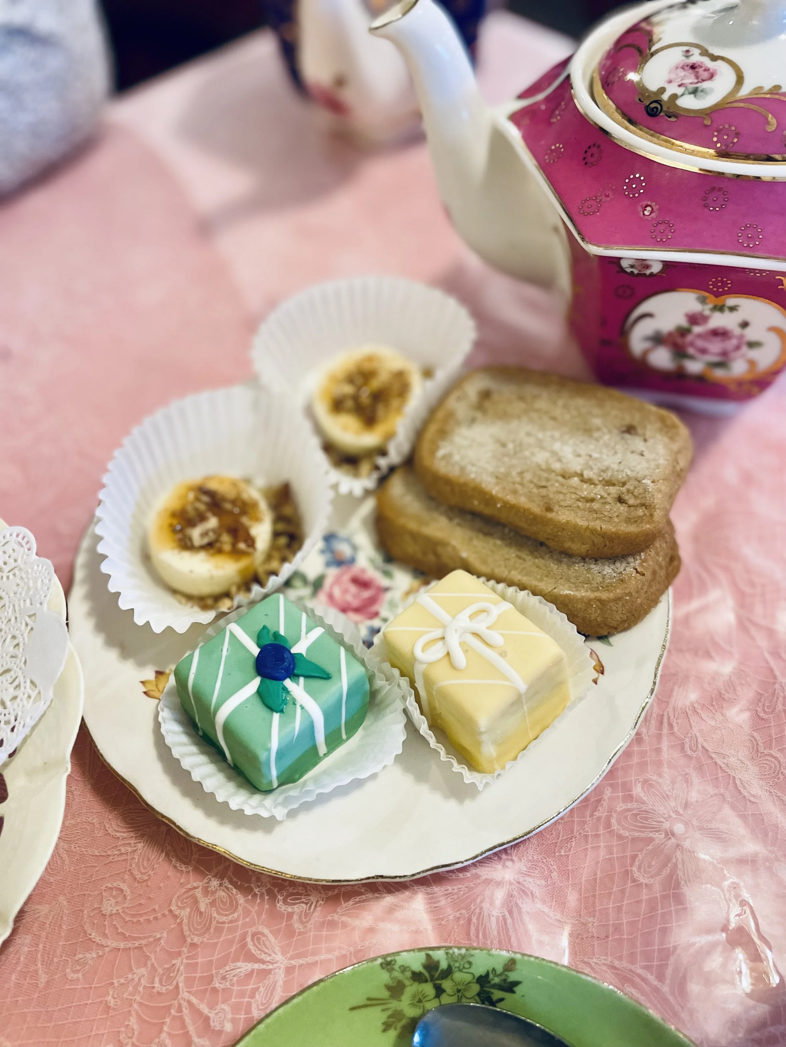 The sandwiches and hot savories were a change from what I usually expect to see at a tea room. Besides the usual cucumber sandwich, there was a large pecan crusted chicken salad sandwich, artichoke and melted cheese on a toasted baguette, a puff pastry pinwheel and mushroom and melted cheese in a phyllo cup.