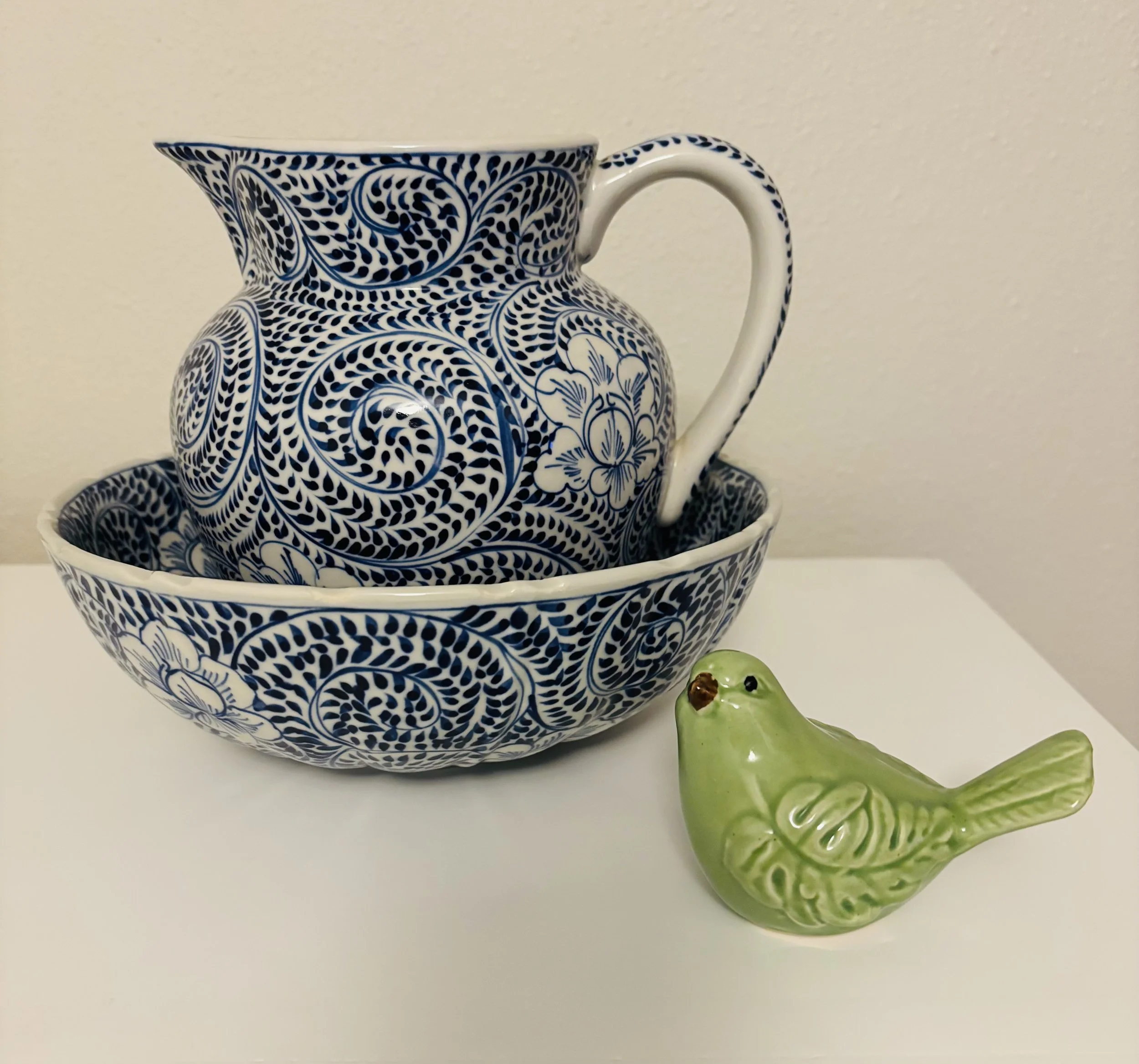 One of my favorite antique and consignment shops had this cute pitcher and bowl. The little green bird was just too cute to pass up.