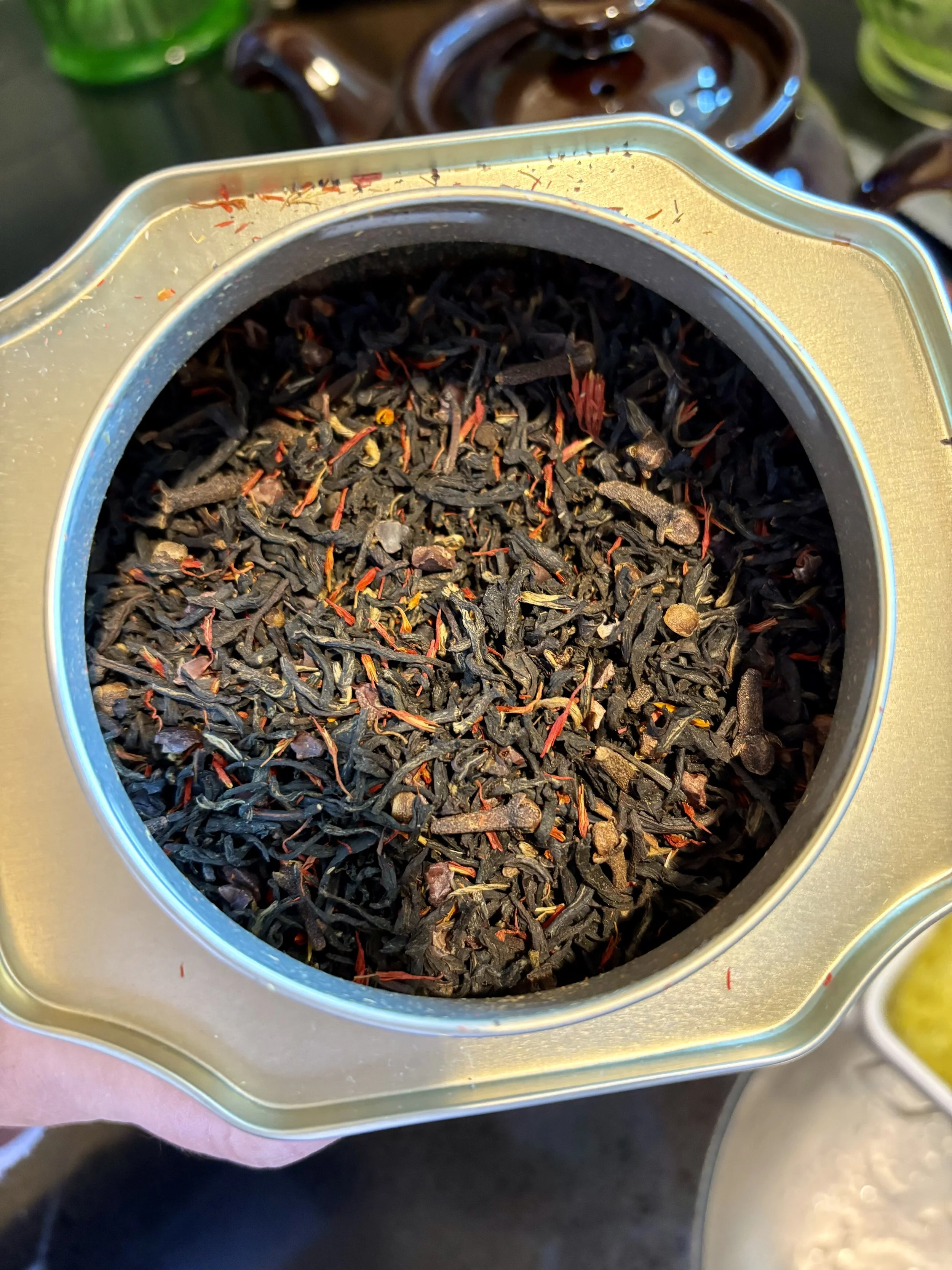 You can see the beautiful tea leaves, cocoa nibs, clementine, and spices. And the smell....it is so amazing. When I add milk and sugar to it (which isn’t for everyone), it reminds me of the holiday season in a cup. I think the flavor resembles hot spiced cider.