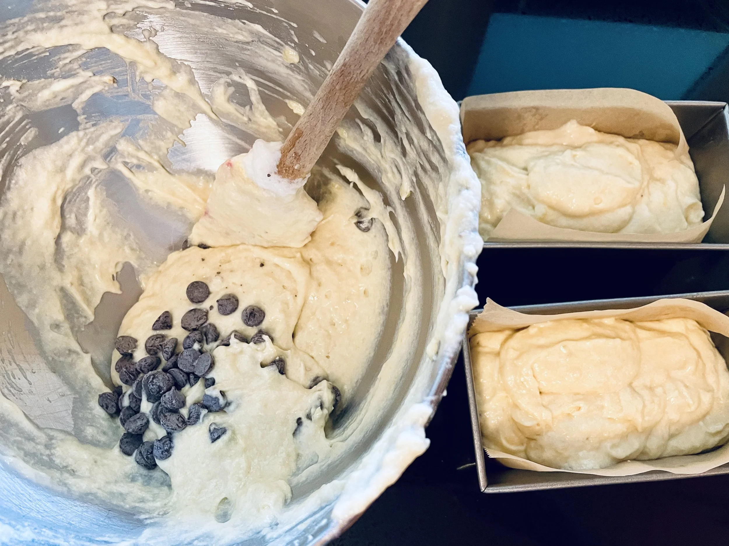 My mother had this old, extra-long, darkened bread pan she used only for banana bread. She would add finely chopped walnuts to the batter using a vintage glass nut grinder. I bake my bread in three little pans and add chocolate chips to one loaf for my kids.