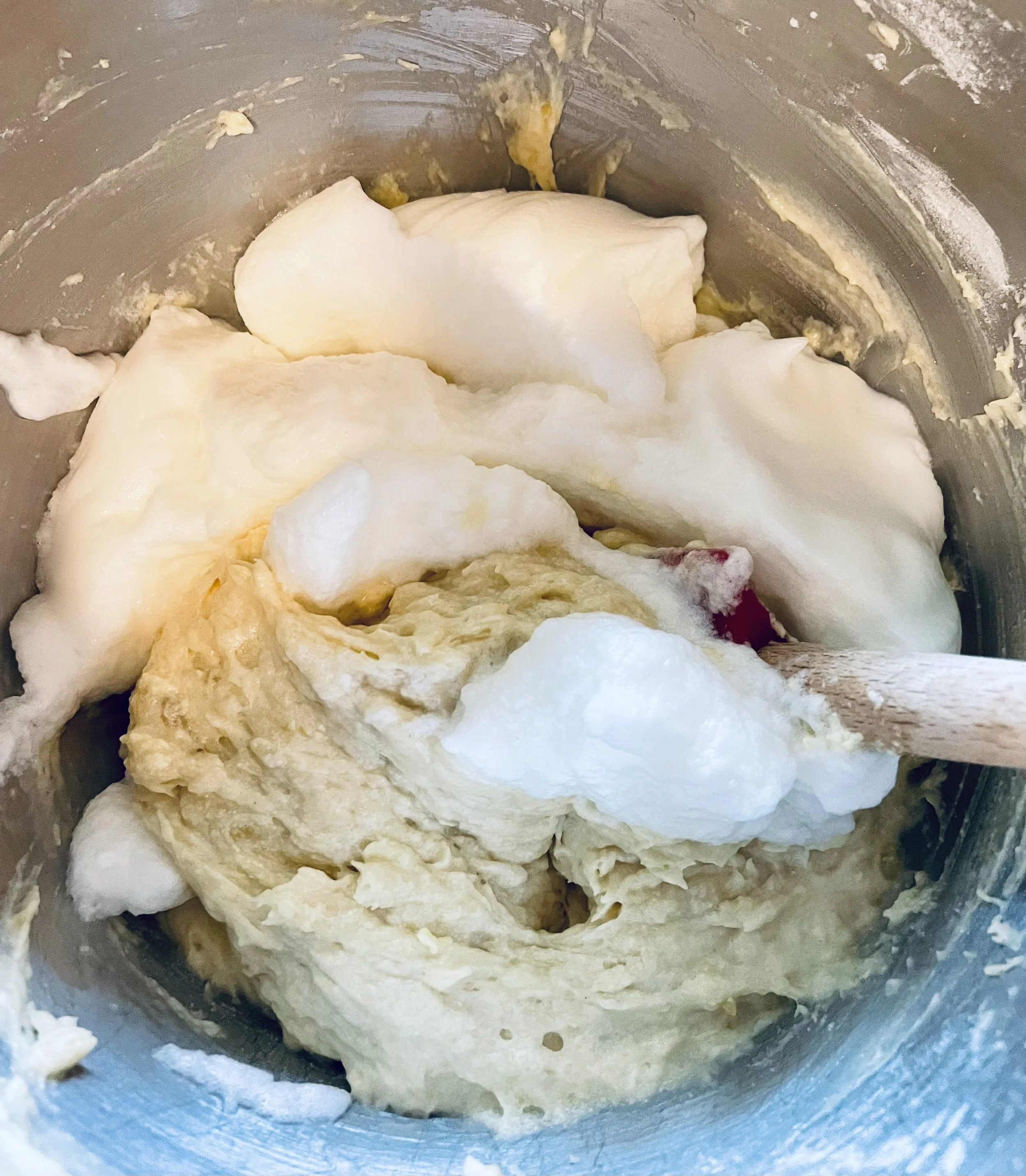 I used to wonder why this recipe called for stiff egg whites to be folded into the batter, which seemed like an unnecessary extra step. But it does create an extra fluffy batter and a nice soft texture once it’s baked.