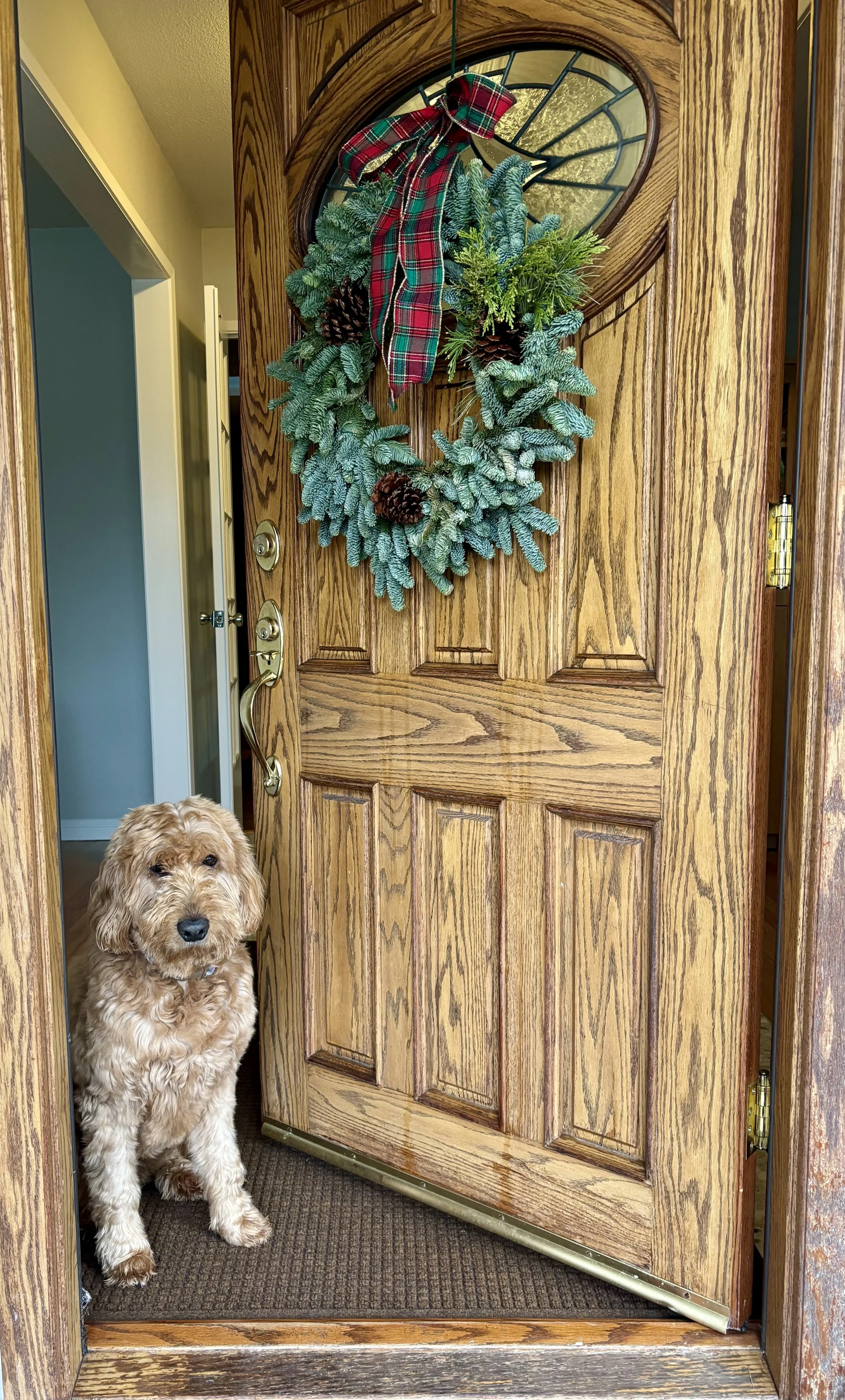 For about seven years, I have taken a photo of our dog at the front door with the Christmas wreath. This year, she was a lot more cooperative!