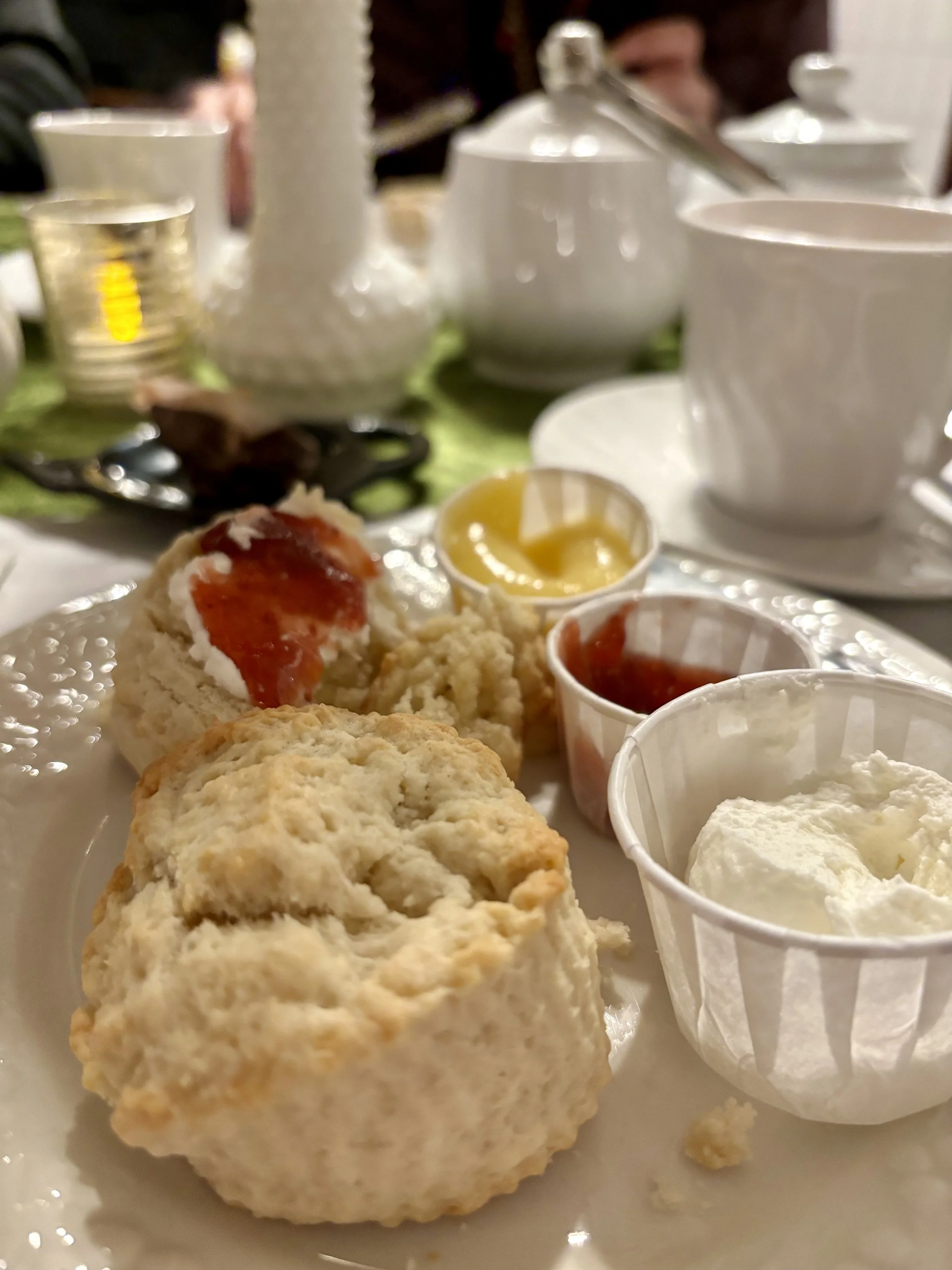 After pots of tea are brought to the shared table, the scones with jam and cream arrive. They were quite good this year!