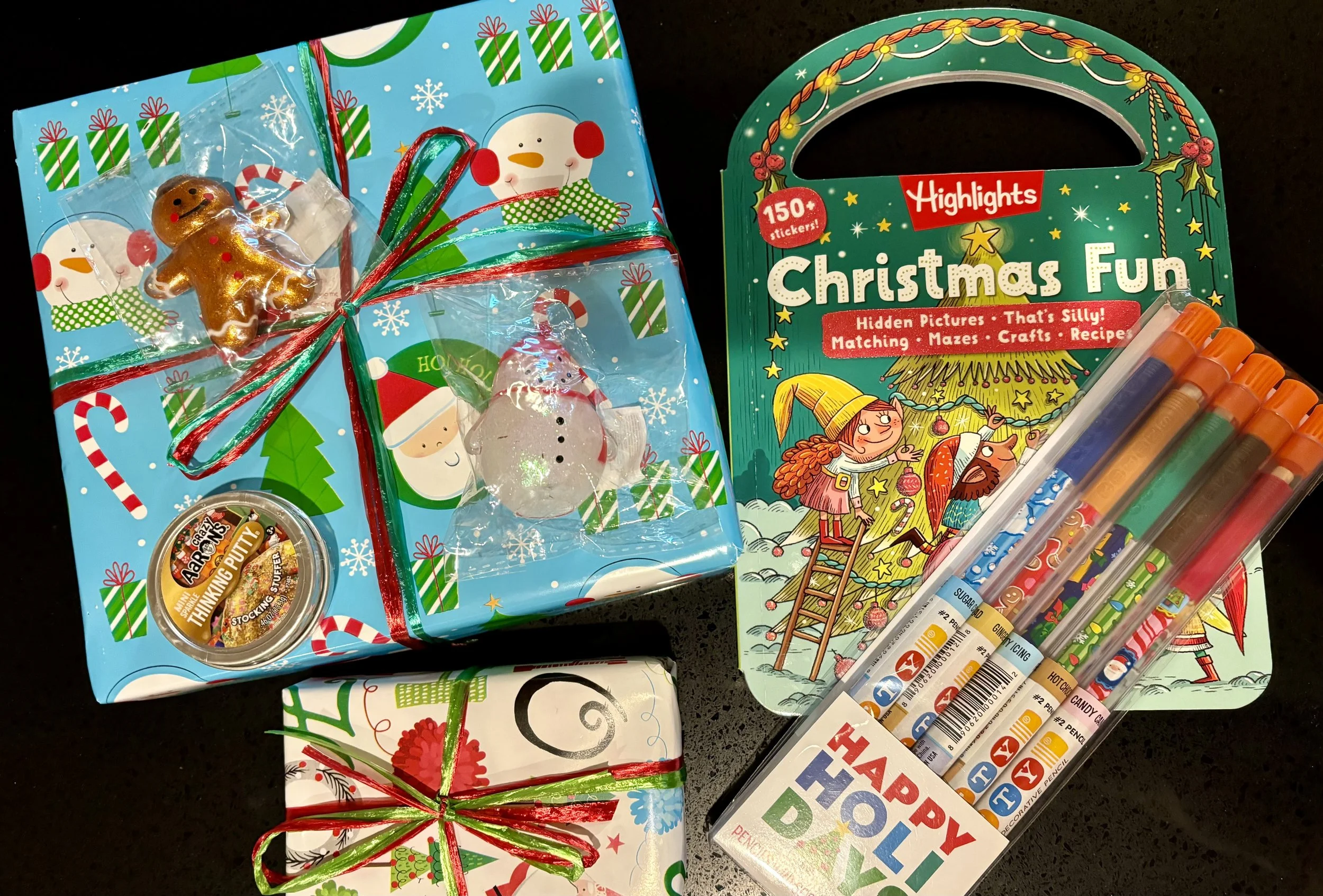 The very first gifts of the season I mailed were to my niece and her family. Of course, everything came from the toy store! I just love the squeezy gingerbread man and snowman!