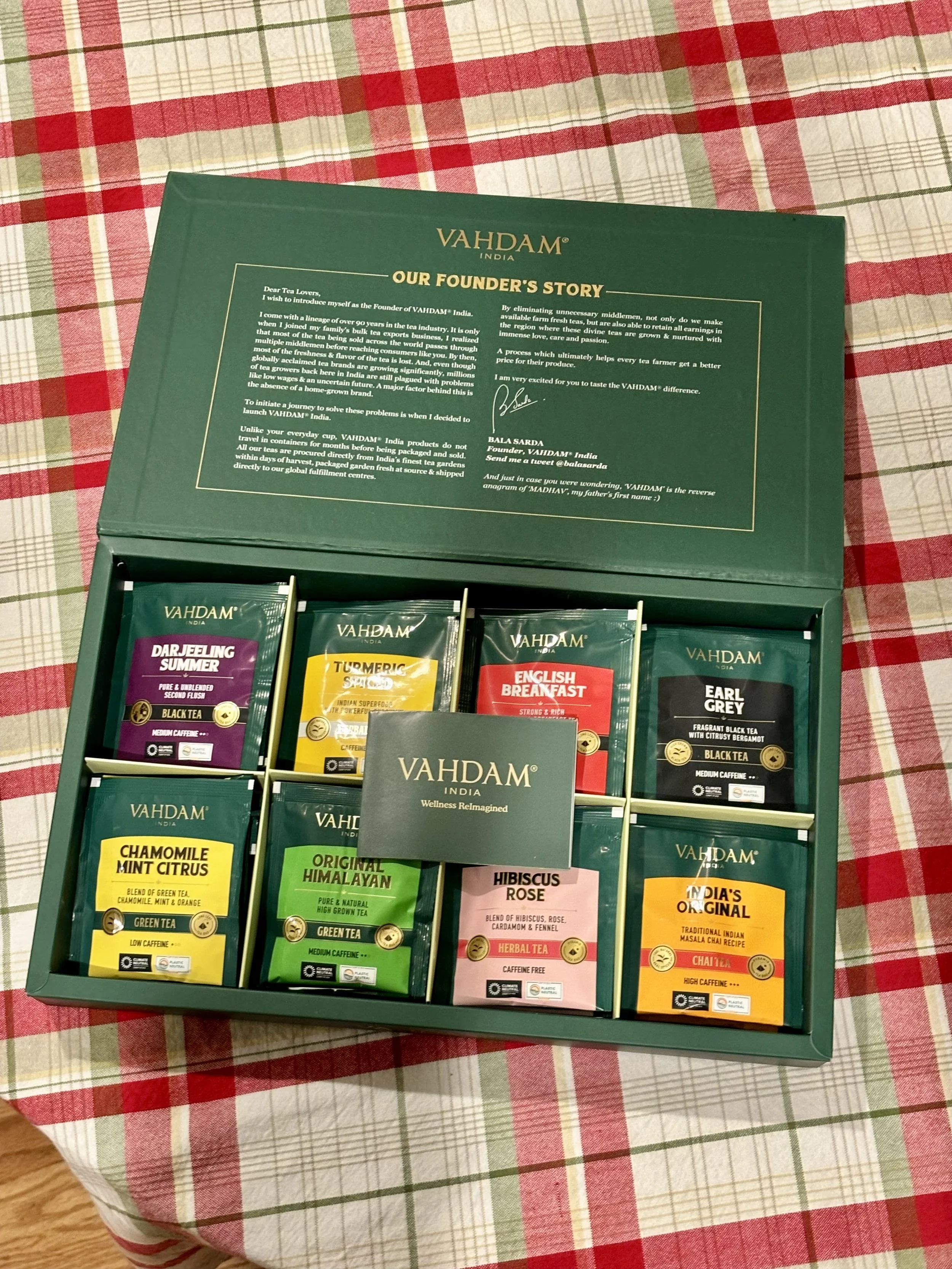 My friends know me so well. One of them gave me this wonderful box of Vahdam tea. My daughter has already tried a couple and loves it. I can’t wait to to try the English Breakfast!
