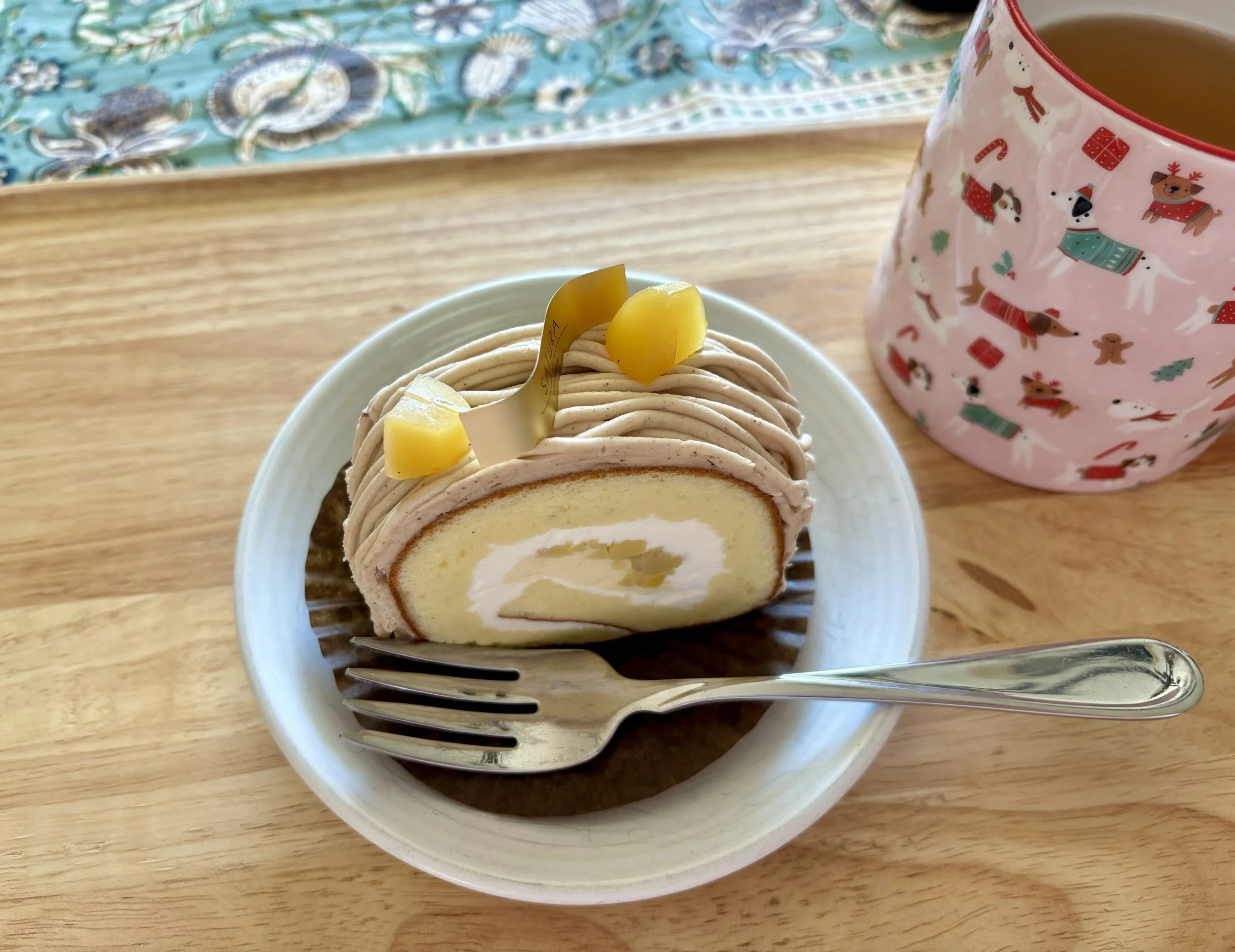 Two days after we returned from traveling over the Christmas holiday, we had another day without electricity while the city did maintenance work in the neighborhood. It was expected to be a very cold day, so we turned up the heating to get the house comfortable before everything shut off. I have a gas stove, so I was able to make a cup of hot tea and enjoy a slice of Mont Blanc roll cake I bought at the local bakery. I love when chestnuts are used in baking this time of year!