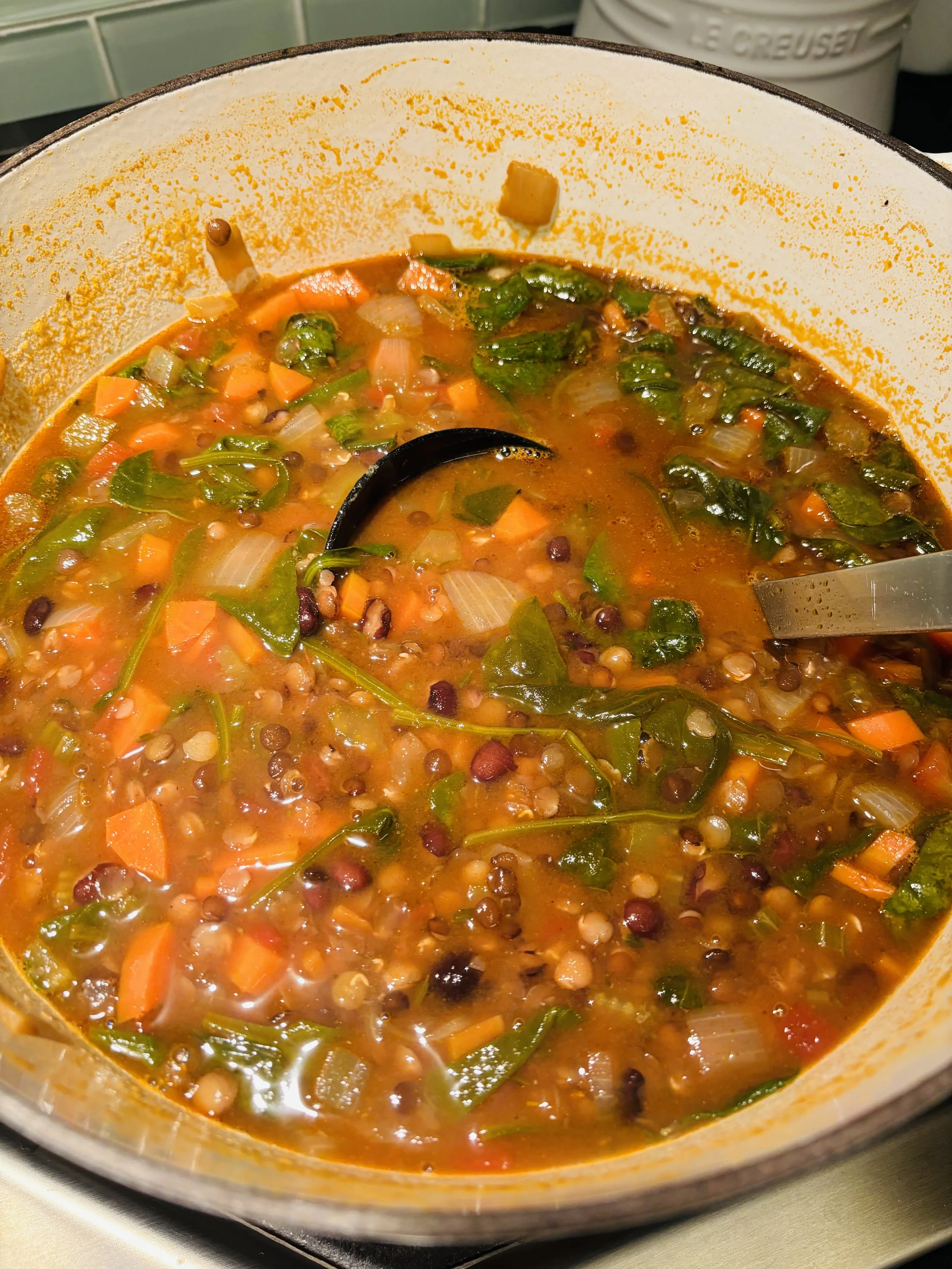 And to round out the lazy day at home, I tried a new lentil soup recipe. Unfortunately, it called for more lentils than I had in my cupboard, and I didn’t feel like running out to the store. I decided to substitute the missing lentils with black beans. This was a cozy, hearty meal to end the day.