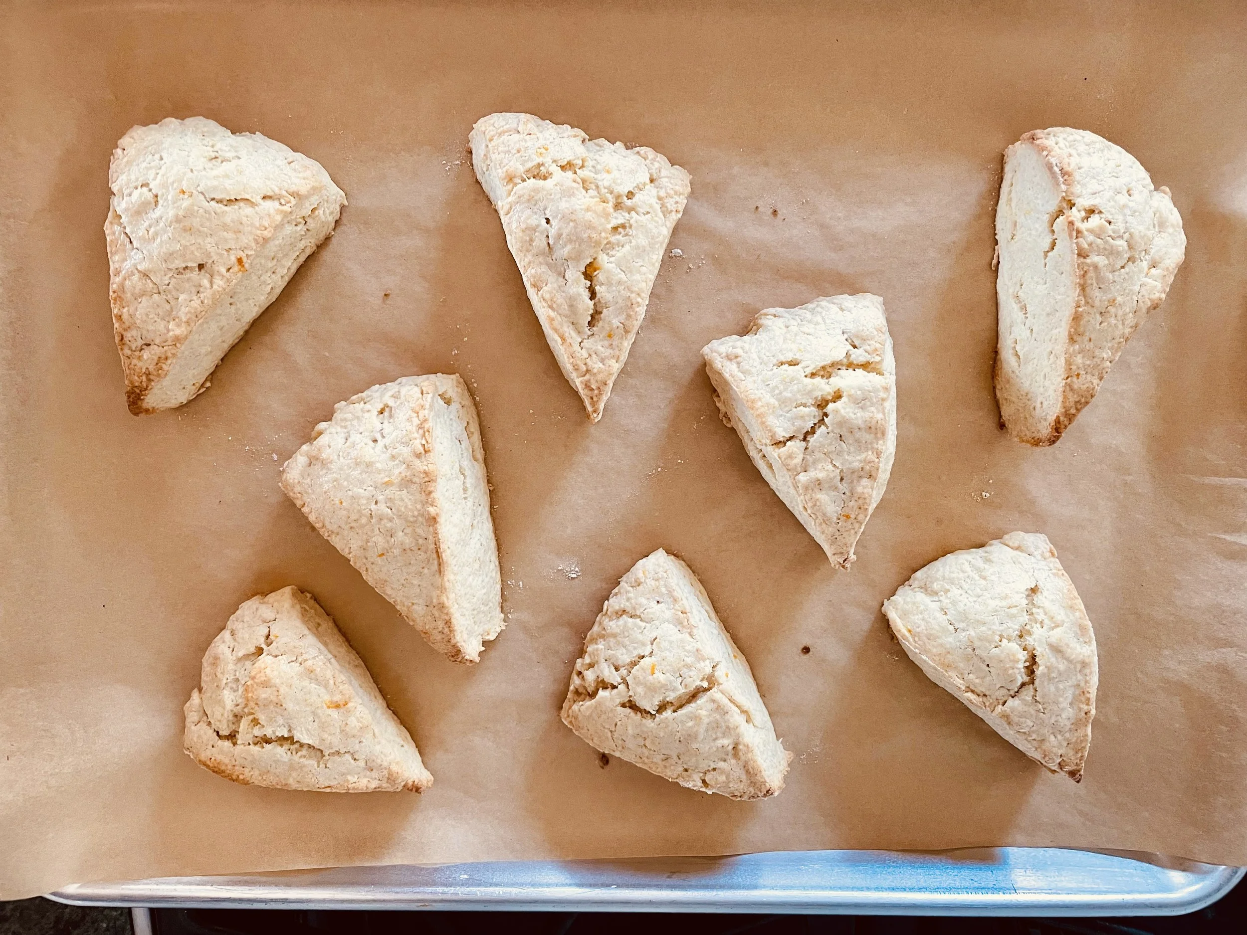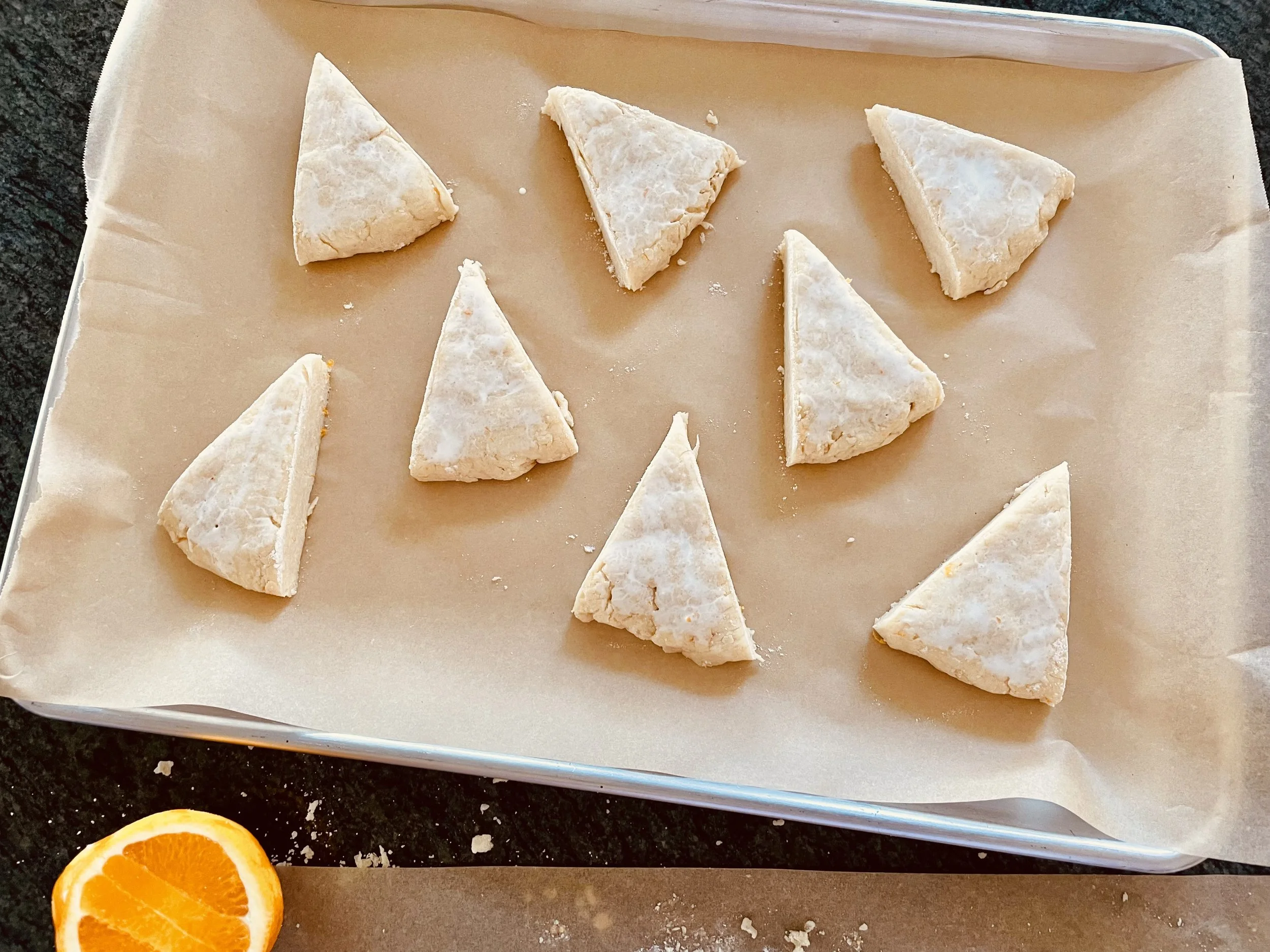 I patted the dough into a circle with my hands since there wasn’t a rolling pin. I didn’t have my scone cutter so I used a sharp knife and made triangles. As usual, I didn’t do the traditional egg wash and used my fingers to dab the leftover heavy cream from the remains in the measuring cup to pat on the tops of the scones, being careful none dripped down the sides.