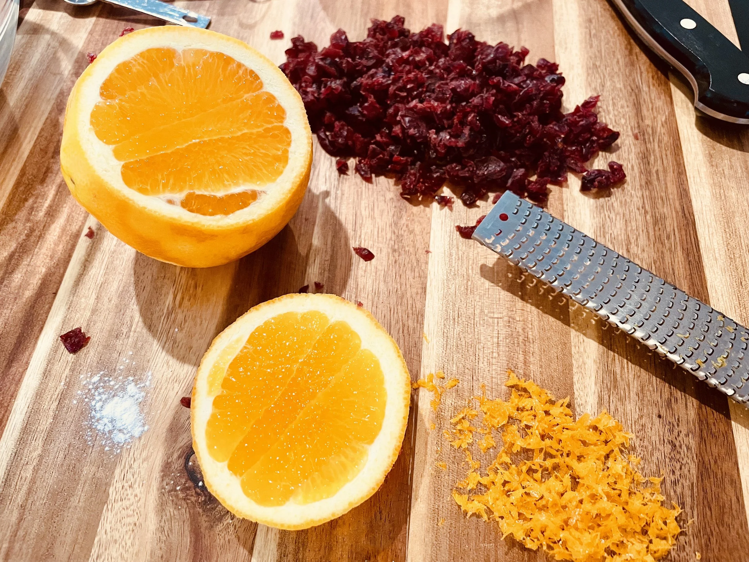 After chopping up the dried cranberries and zesting an orange, I cut off a small part of the orange to add additional fresh juice to the dough mixture. It’s not included in the recipe but I do this with my lemon loaf recipe to enhance the fruit flavor so I decided to add a little to this recipe, too.