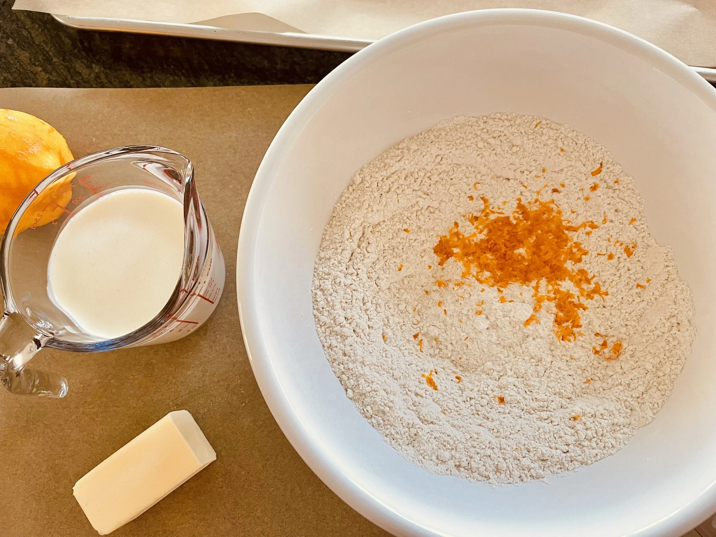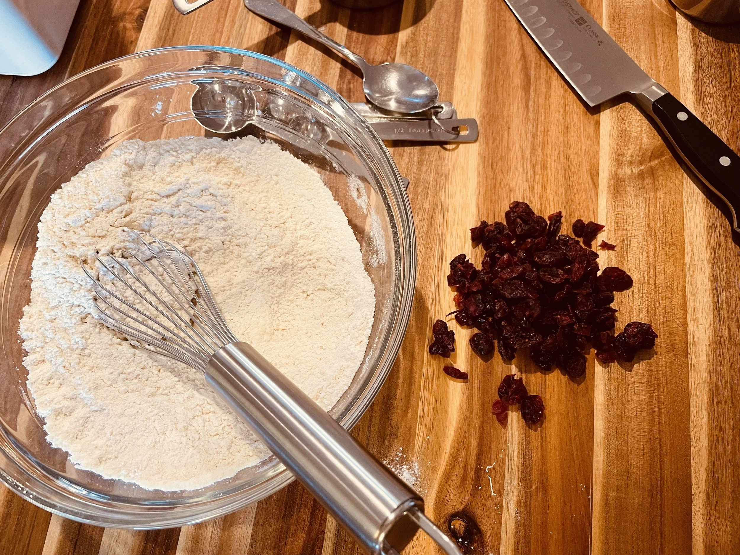 Parchment paper on the counter worked just fine for turning out the dough. There was a cheese grater that I used to zest the orange. It worked perfectly when I made short strokes. Working the butter into the flour mixture and orange zest really distributes the essential oils and flavor from the zest into the dough. I didn’t have dried cranberries this time, but no one was bothered by it.