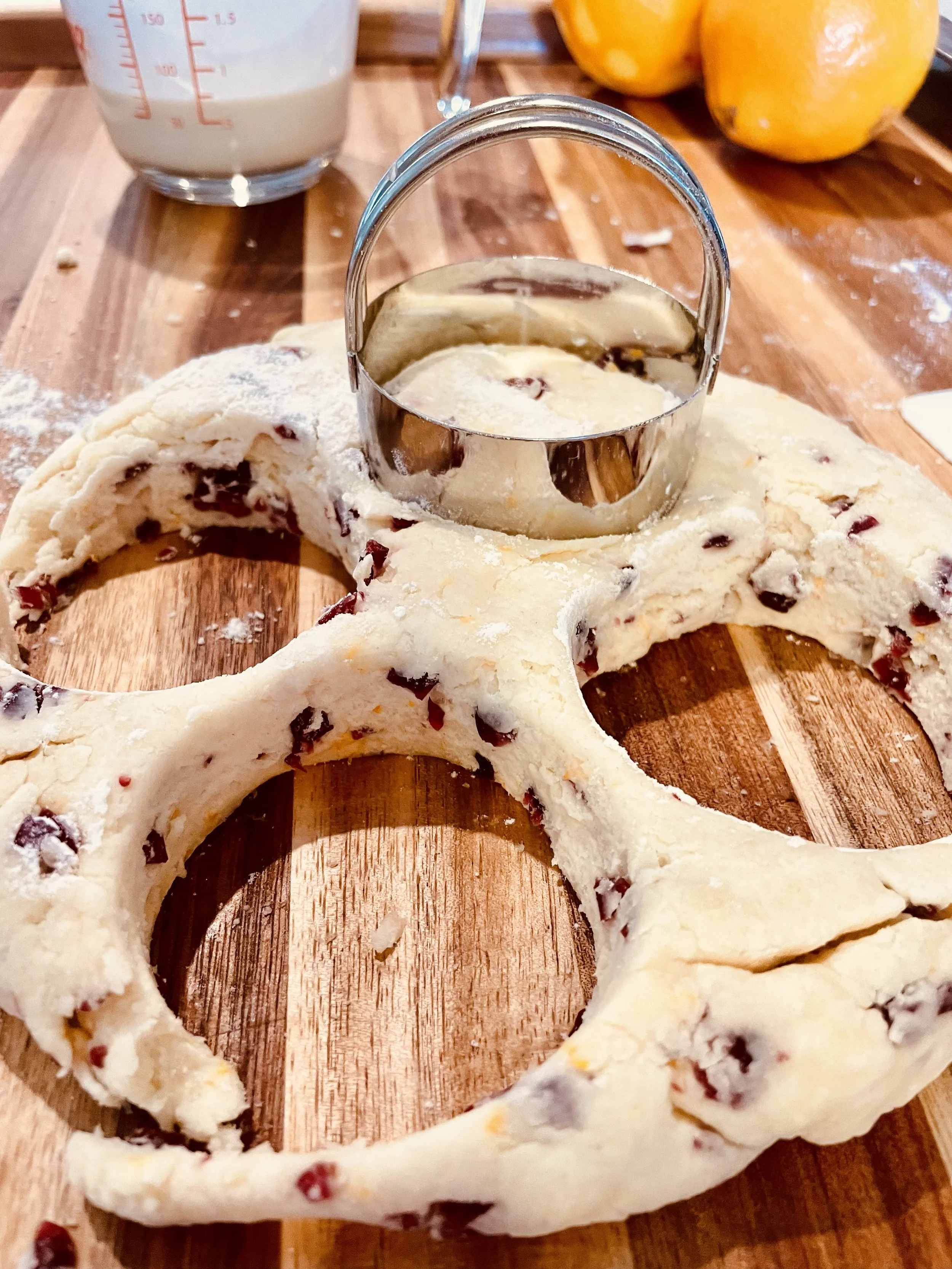 I prefer round scones and I love the way the dough looks with the chopped cranberries and orange zest studded throughout it.