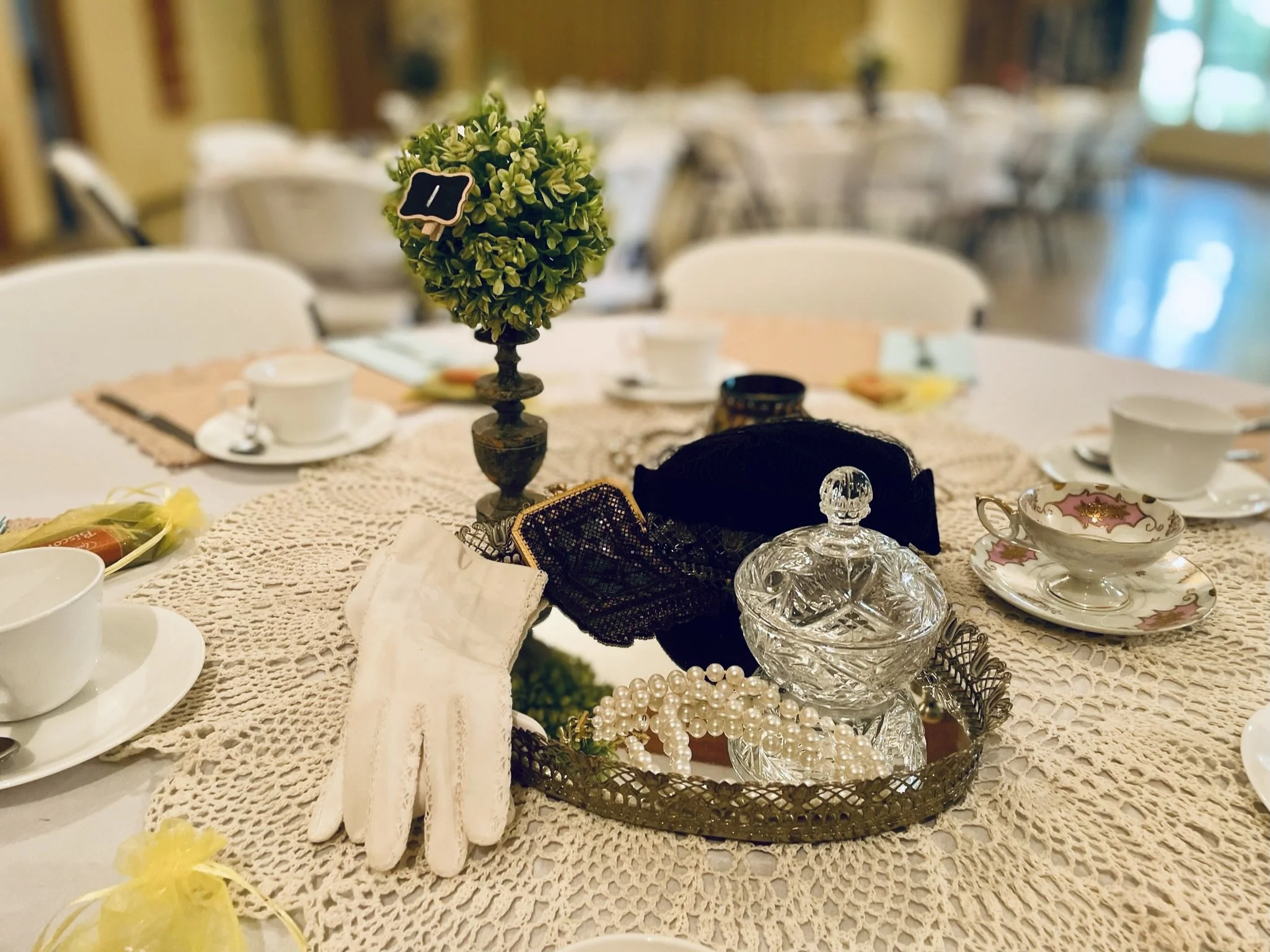 Because there aren’t funds for decorations, Historical Society members were asked to collect items from their homes that could be used to create the appropriate ambiance for the tea. We then spent more than three hours the morning before the event setting up the room and creating centerpieces for the tables. It was so fun and interesting to see what everyone brought.