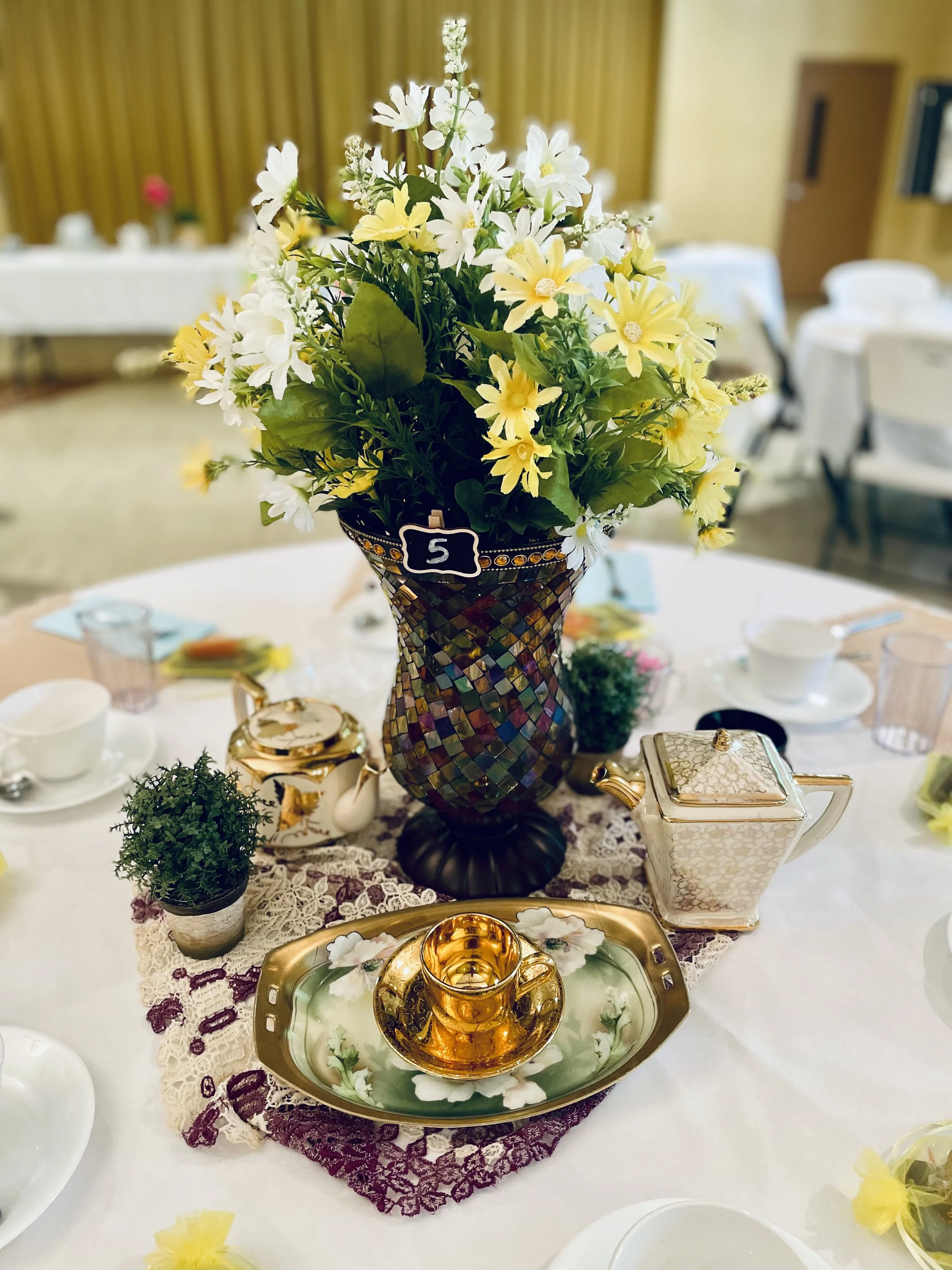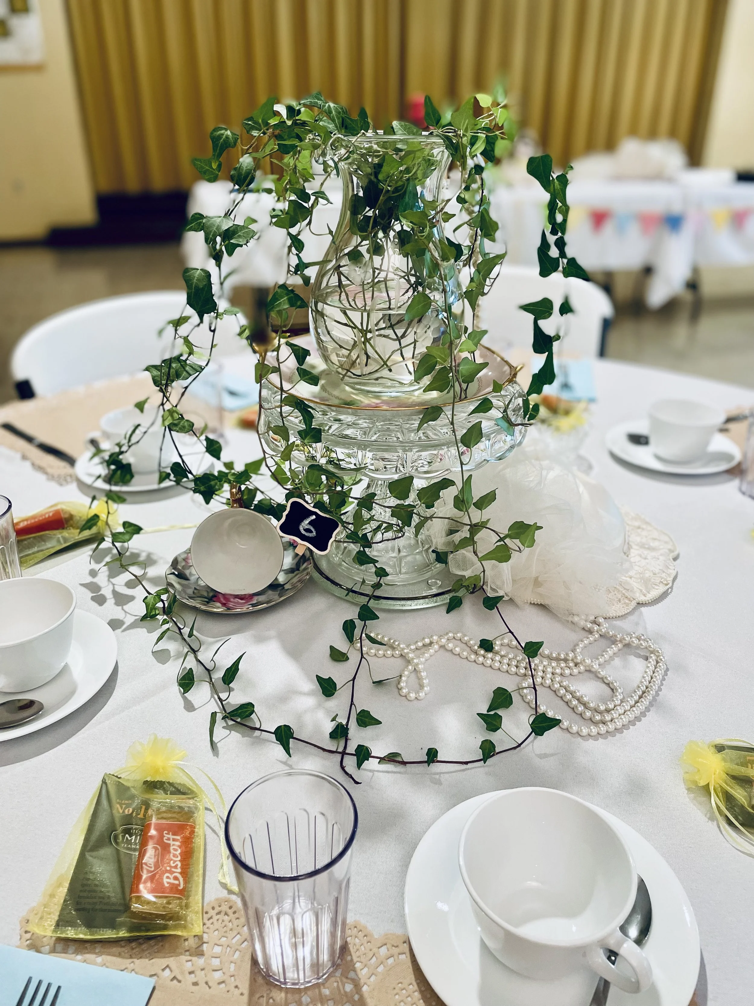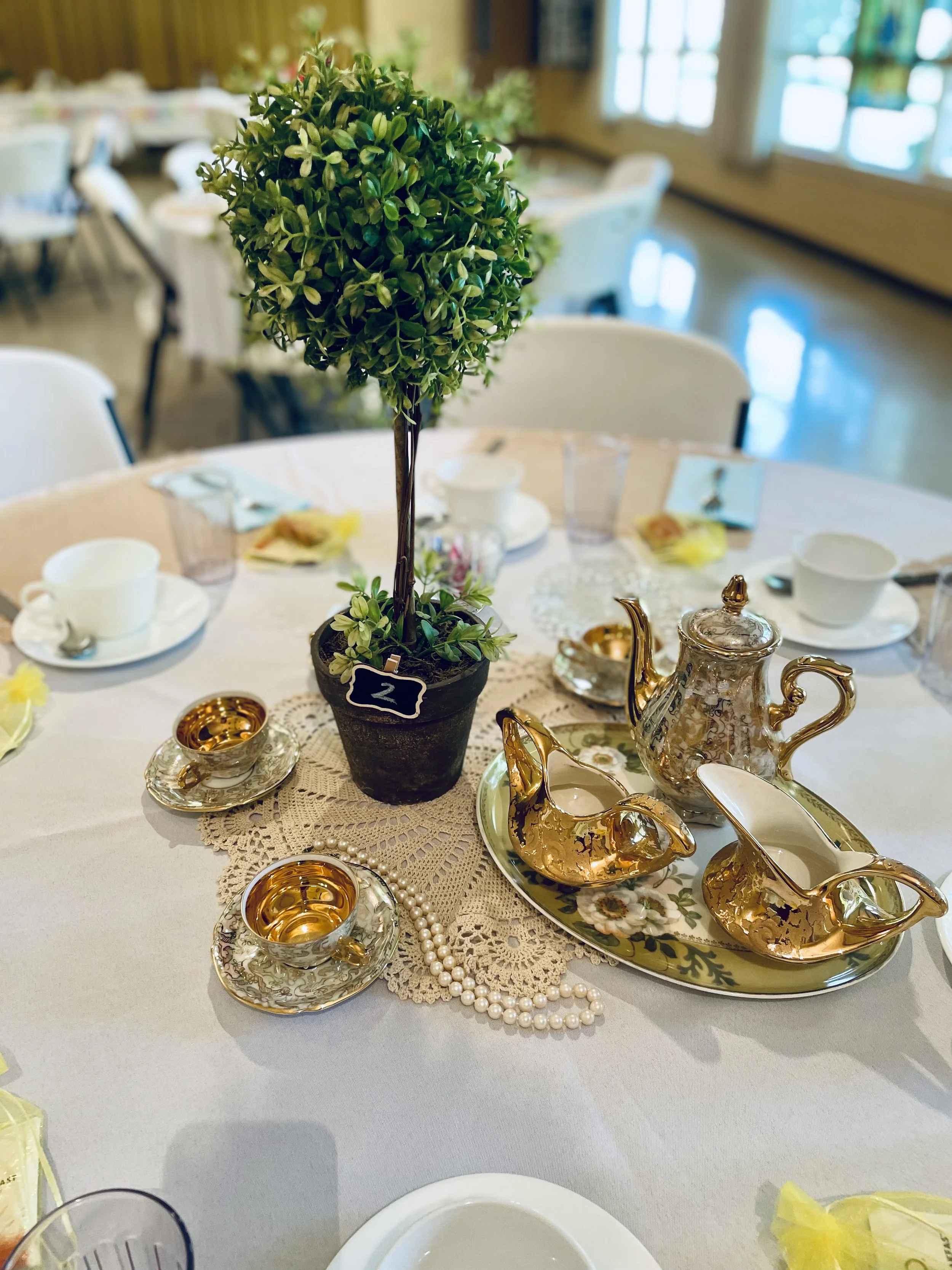 A combination of gold vintage cups and saucers with a doily and “pearls” really gave this centerpiece an elegant touch.