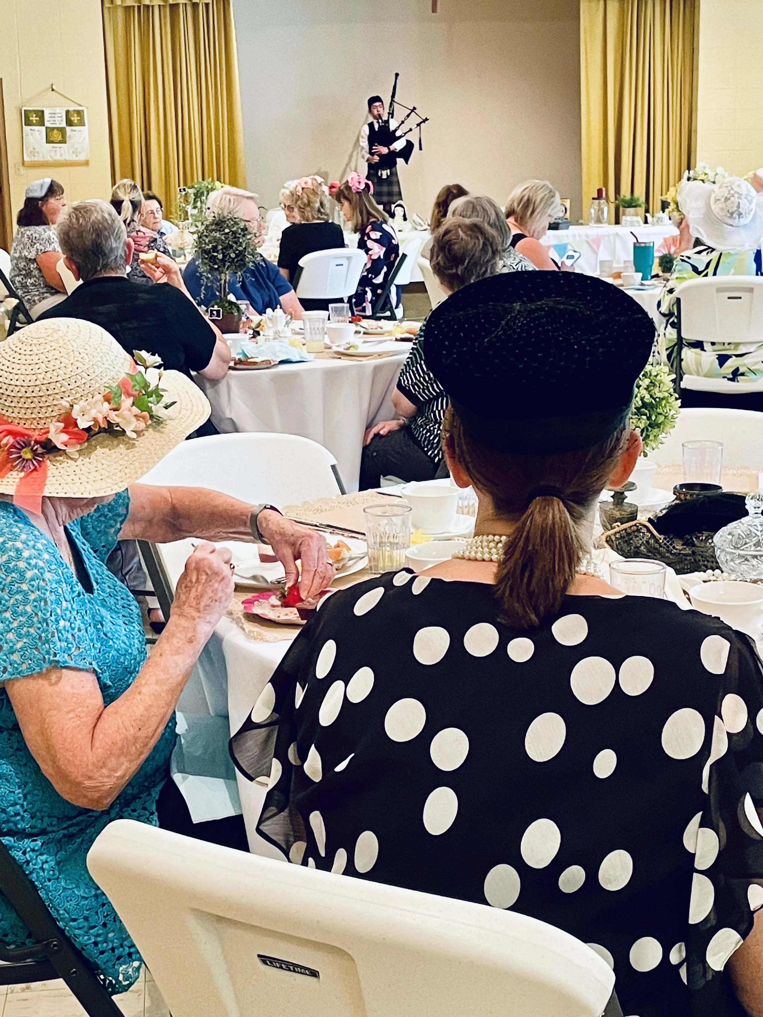 After a Historical Society member welcomed guests with a brief introduction to the Society and a poem reading, teenage volunteers poured tea, lemonade or water. Plates with three types of sandwiches, two warm savories, a scone with jam and cream, fruit, three mini desserts were then distributed. Each guest received a little goodie bag and my son entertained the group with tunes on his bagpipes.