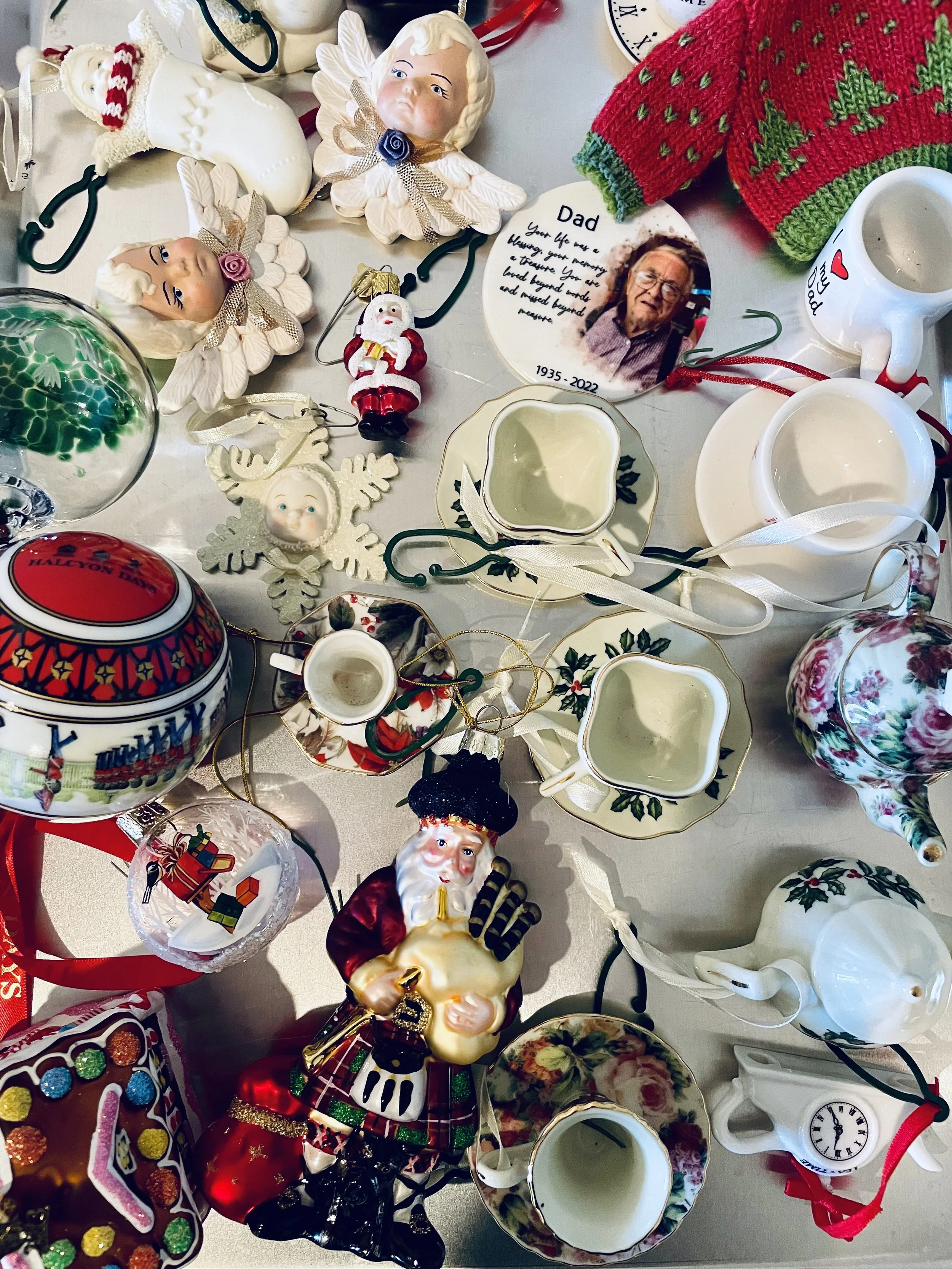 So with the loss of those so dear to my heart, I can remember them in little ways. My mother painted the two angel ornaments with blue and pink roses. I still have the box she wrapped them in and the little note she wrote on top. Whenever I hang them on my tree, I think of her. This past December, I hung them next to my father’s ornament, a gift I sent to my siblings for their trees. Most of the teacup and teapot ornaments are from a tea room my family and I loved to visit near my hometown. One holiday my husband joined us. It was the December he proposed.