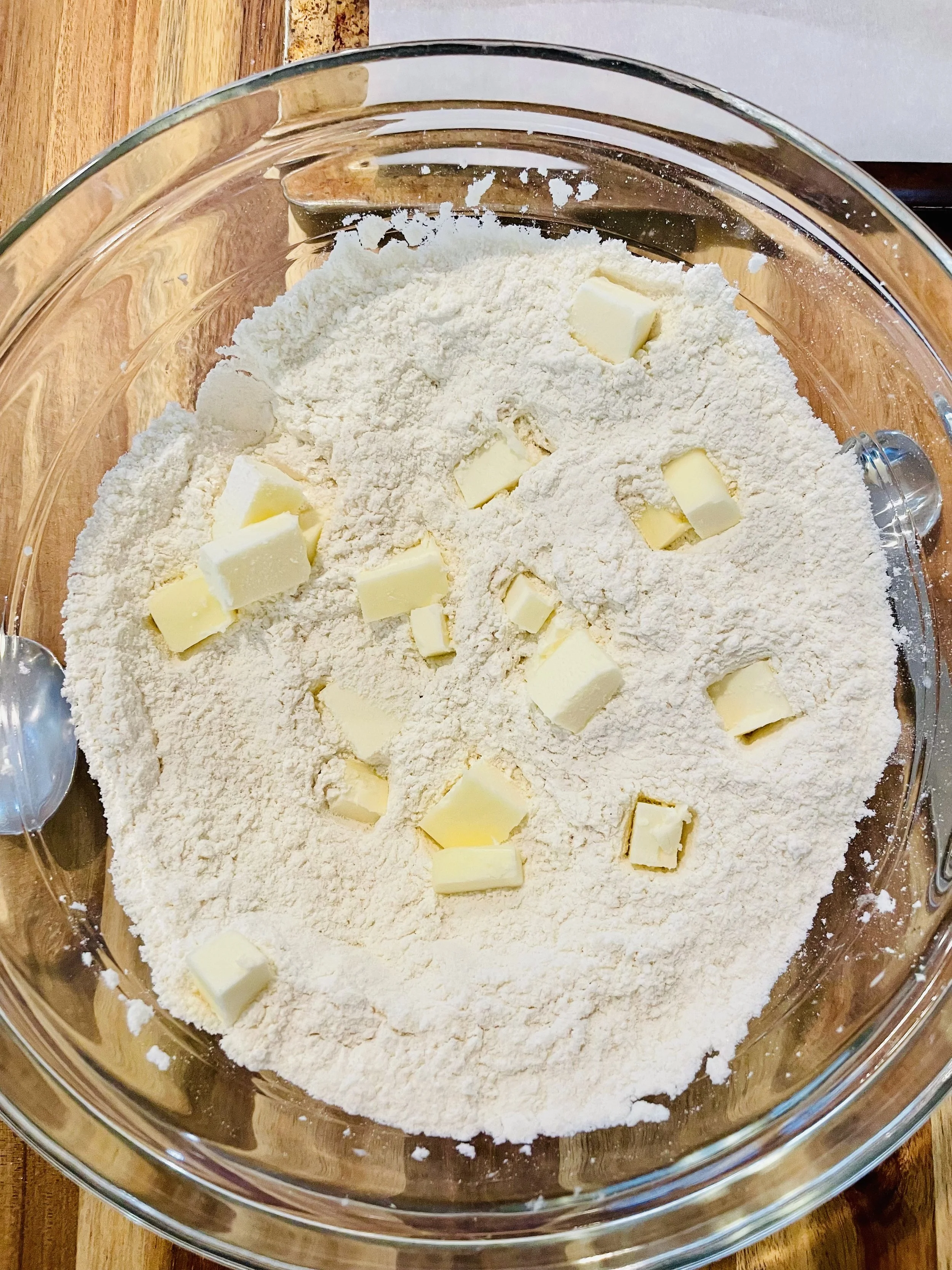 Cold cubed butter is added to the flour, baking powder, salt and sugar mixture.