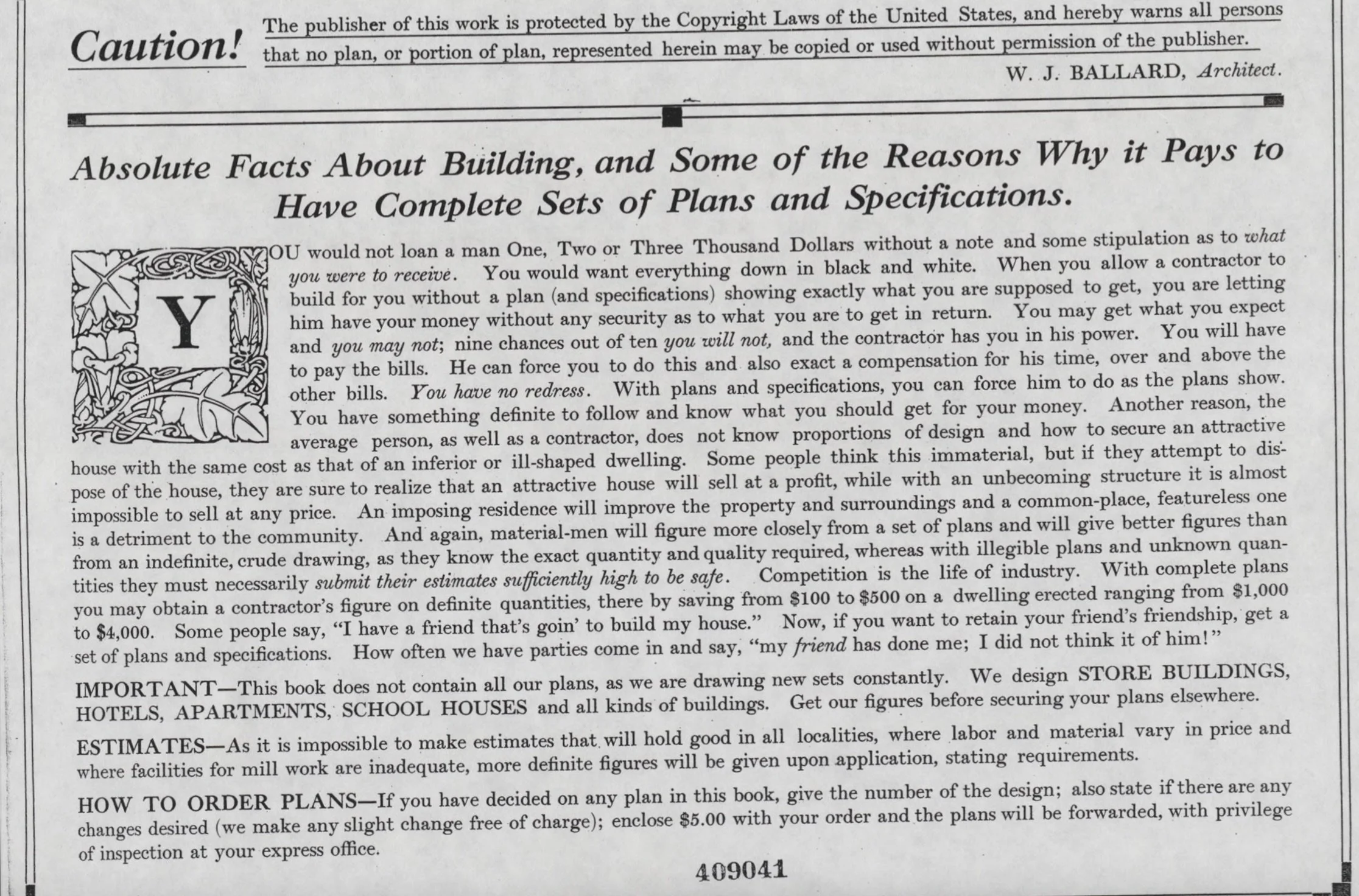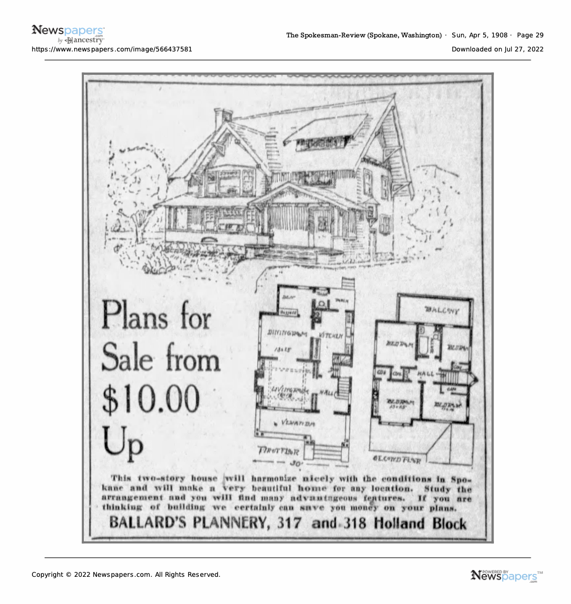 A Ballard Plannery Co Architects newspaper advertisement. The architectural firm did a majority of their advertising in the Spokane newspapers between 1908-1910. They were producing plans from 1908-1920.