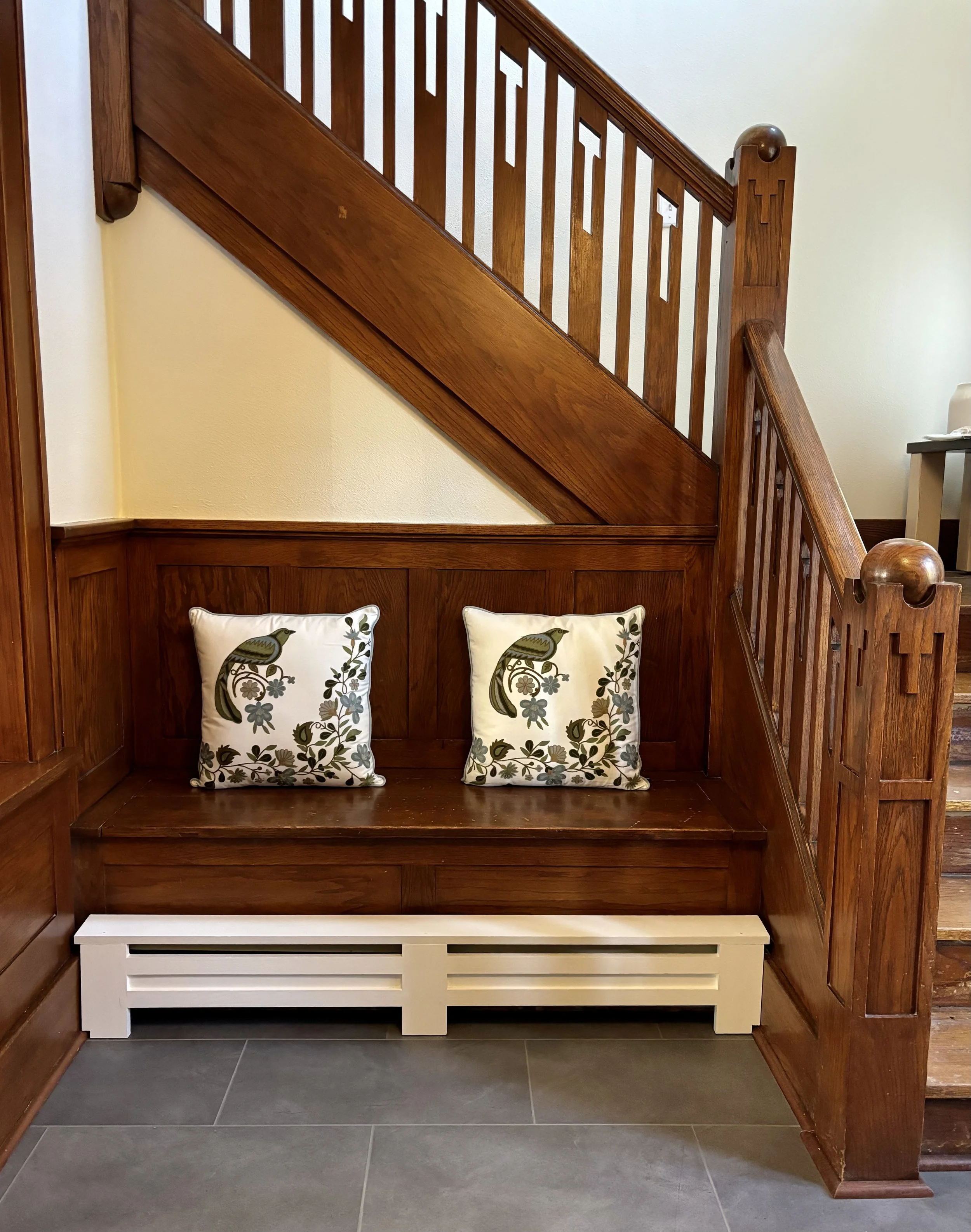 I decided to forego refinishing all the woodwork since I neither had the time or the extra funds to do it. Instead, I wiped everything down and used stain markers wherever there were little gashes in the wood. The old-fashioned metal radiator covers were replaced with handmade wooden ones.