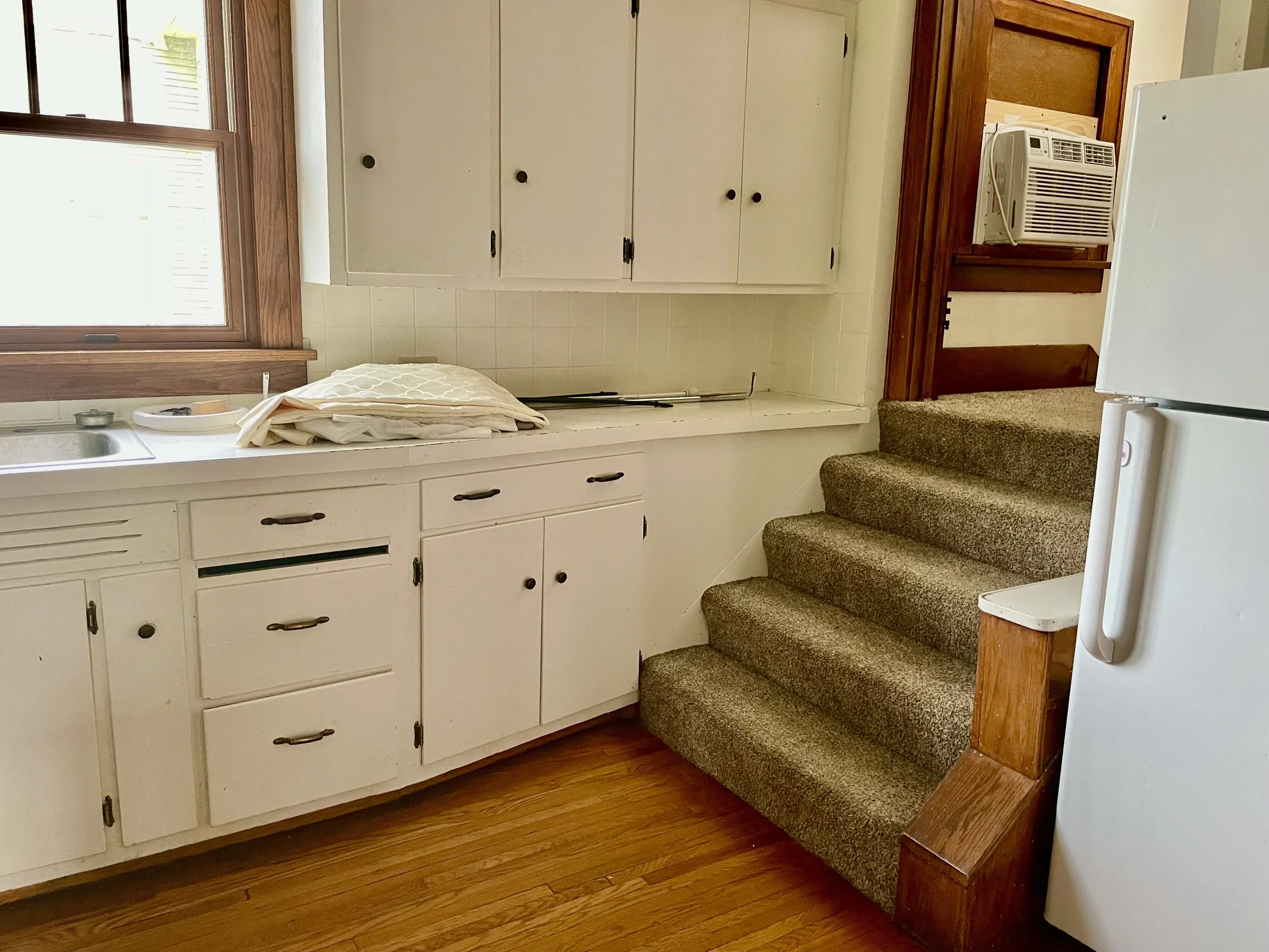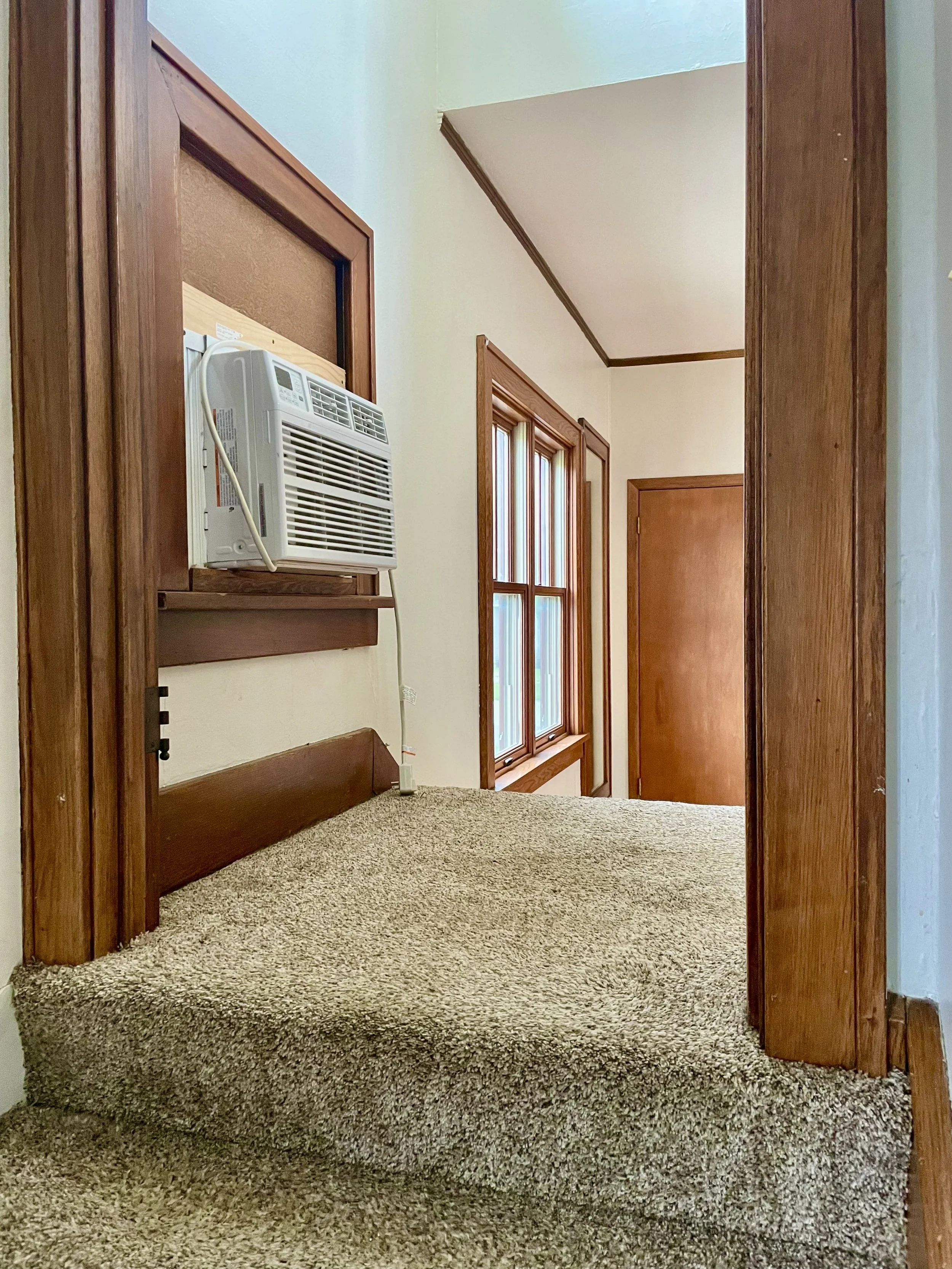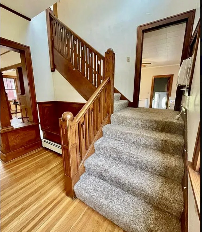 Over the years, carpet was added to the stairs, but there used to be a stair runner held down by rods. We discovered this after the carpet was removed and saw the holes where the rods used to be. It was also common in older homes for the same set of stairs to lead from the front entry upstairs, and to the kitchen. The door to the kitchen was removed.