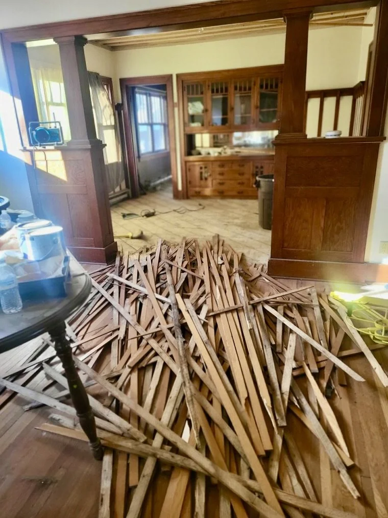 Carpet tack strips are a nightmare to remove, as well as all the staples that were used and dotted the floor. My brother took care of this room while I tackled the stairs.