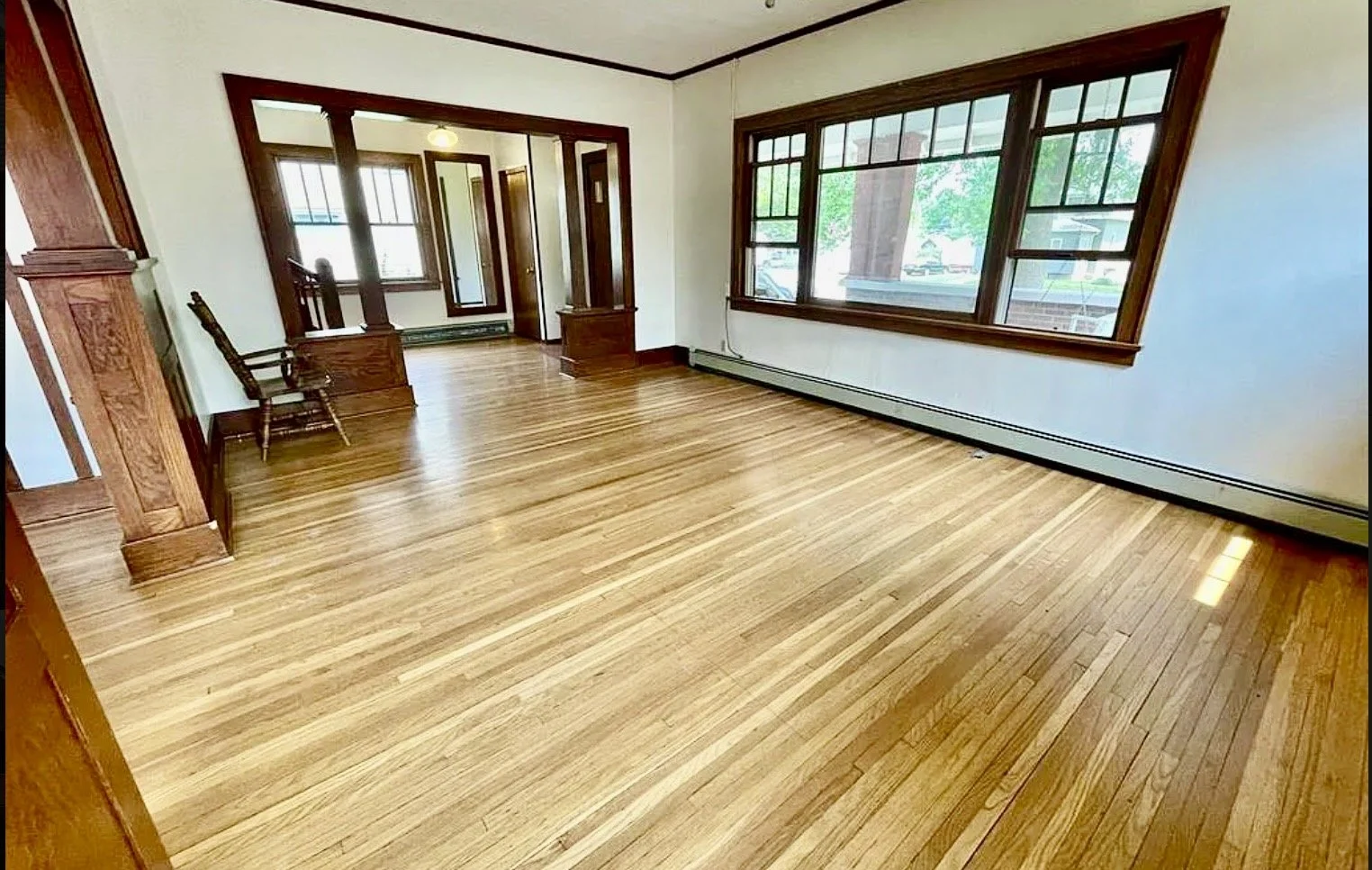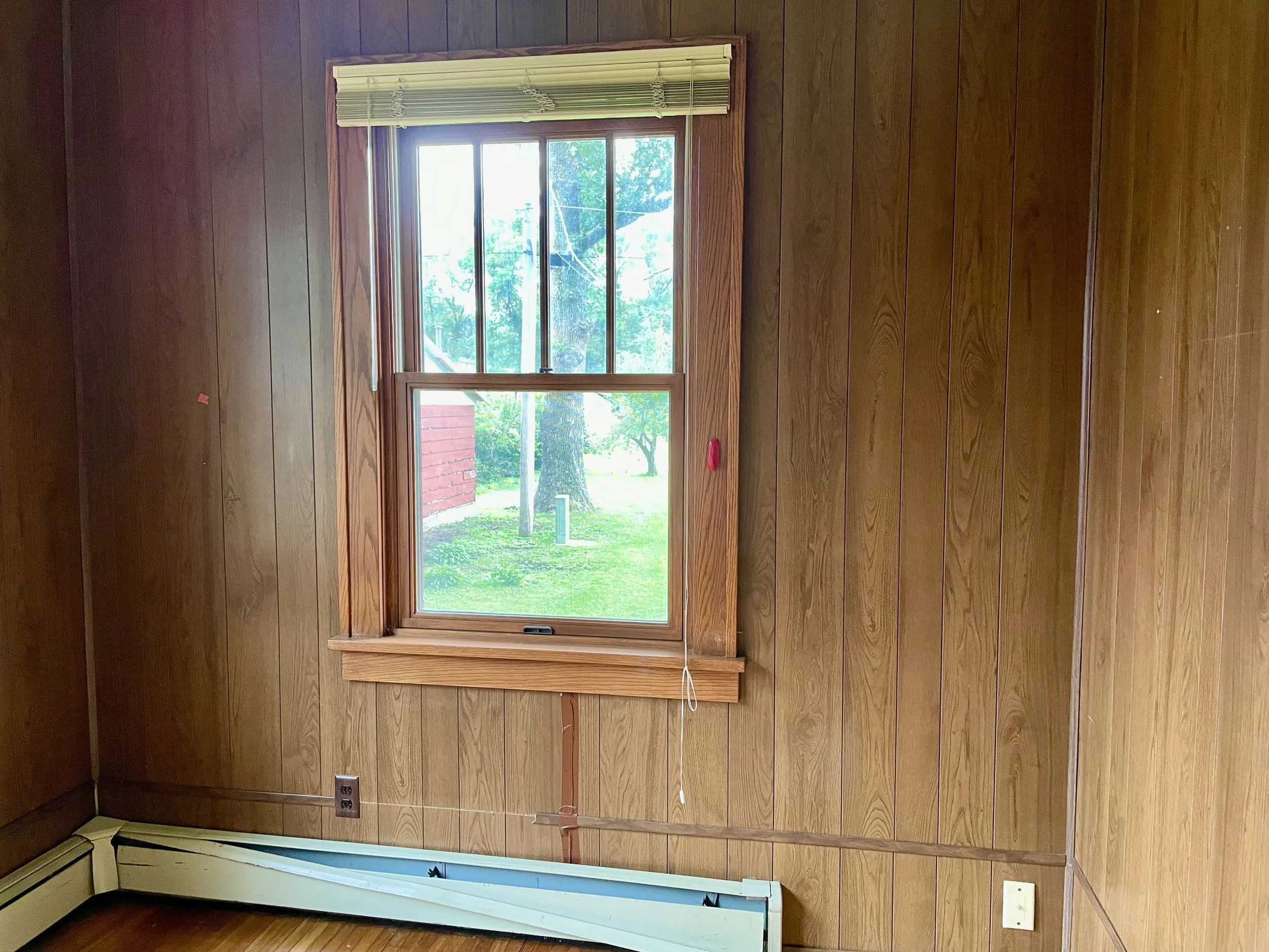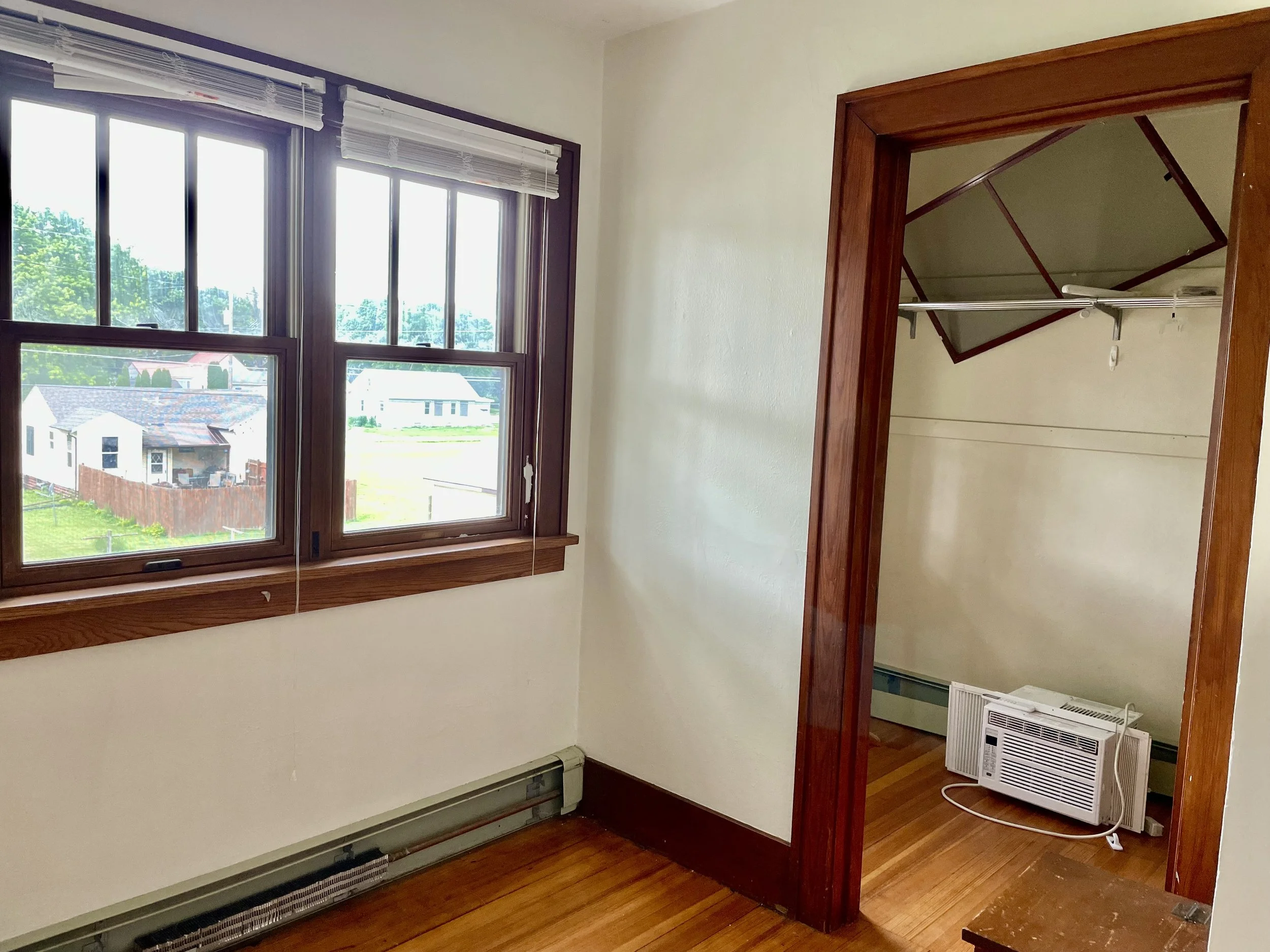 This is one of the upstairs bedrooms. The floors and woodwork are in good condition but the windows need to be replaced as they are original. It will also get a fresh coat of paint and the blinds will be removed. Once the new radiator covers are installed, an organizer added to the closet, and a new ceiling fan put in place, this room will be done.