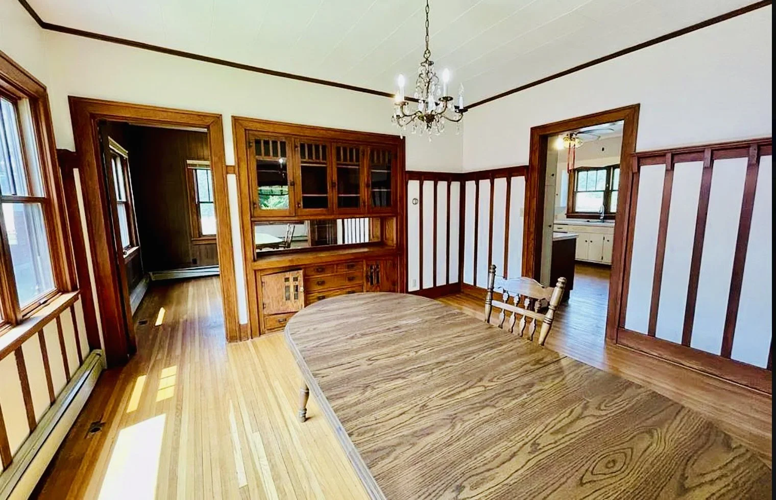 This eating nook in the kitchen is original. It only supports my idea the white kitchen cabinets are not original. Such a shame.