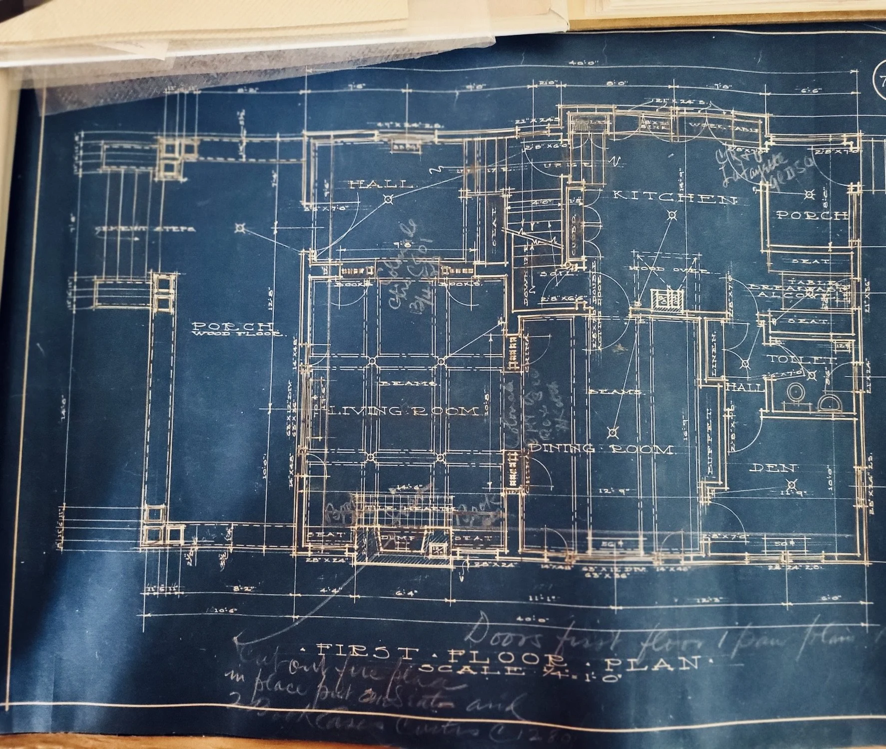 After purchasing the house, my sister asked the church if they had any old photos to see what the house looked like when it was first purchased. Unfortunately, they only had ones that were most likely taken from the late 1950s or 1960s. But they did have something we never expected and is very rare, the original blueprints.