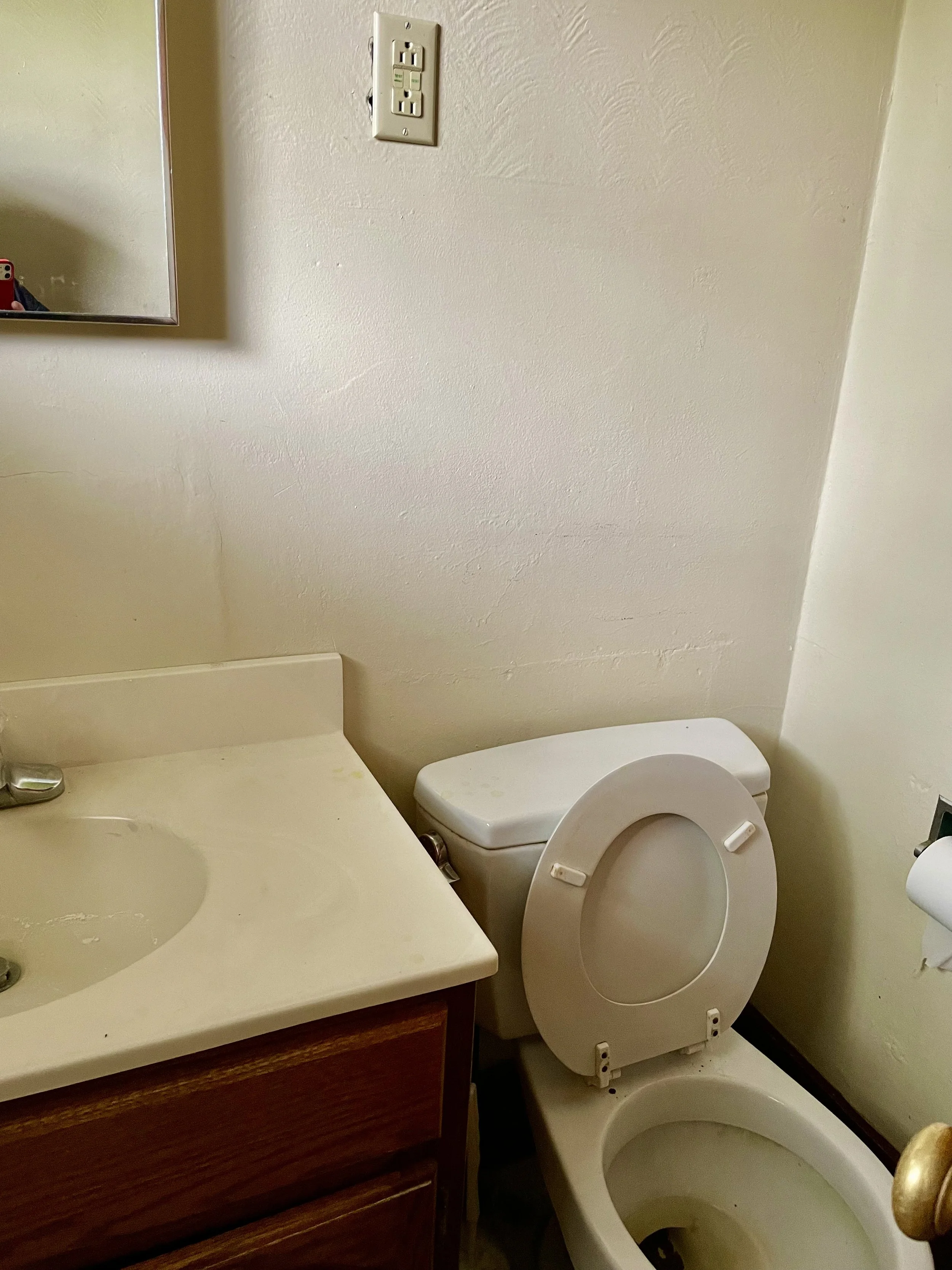 The toilet in the small powder room was positioned just behind the door, so every time you opened it, it would hit the toilet. You can see the doorknob in the photo. I’ve removed the dated vanity and the toilet and will position the new ones to the outside wall, well away from the door