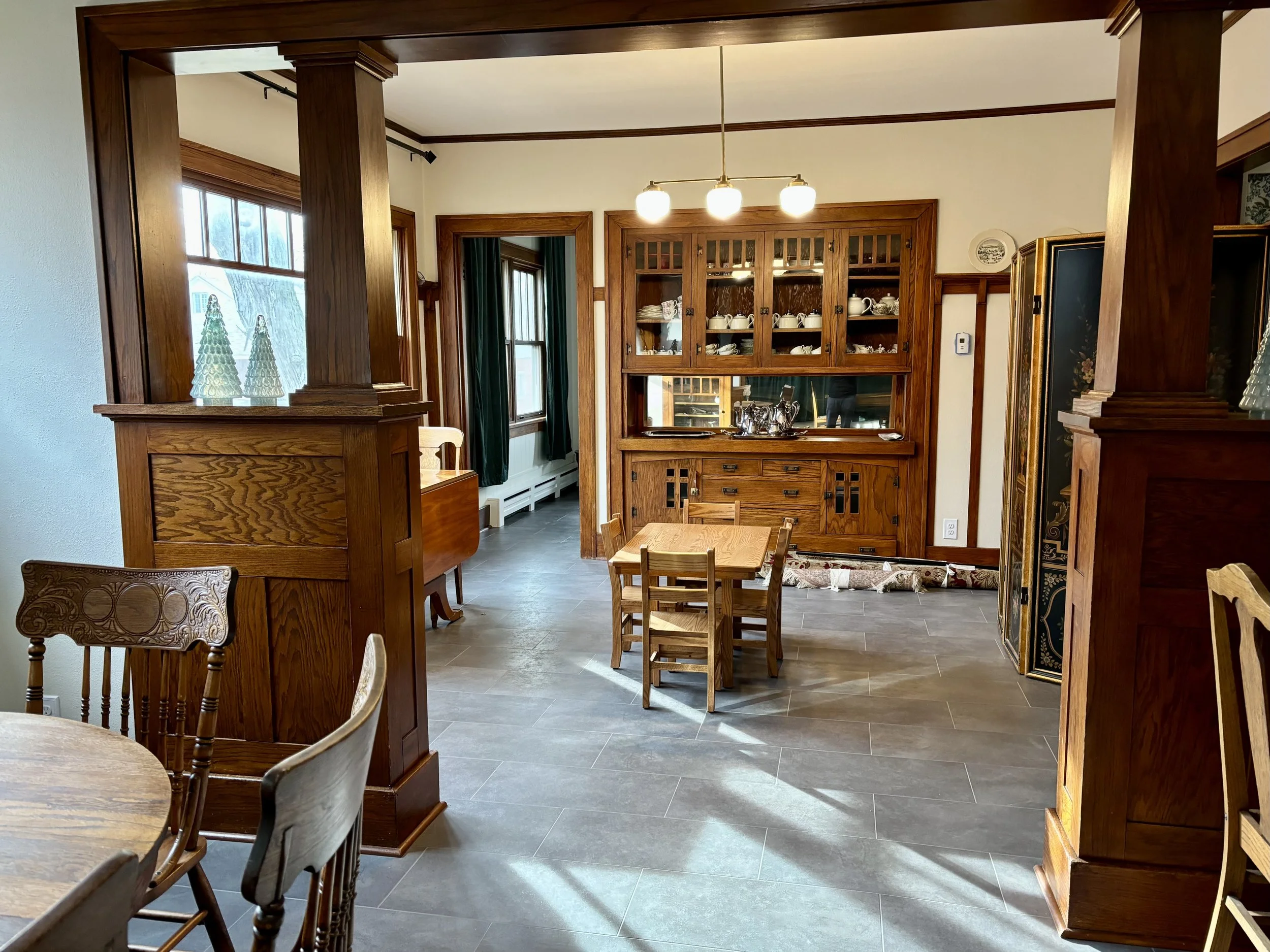 This is the dining room facing the living room, revealing the built-ins in the colonnade.