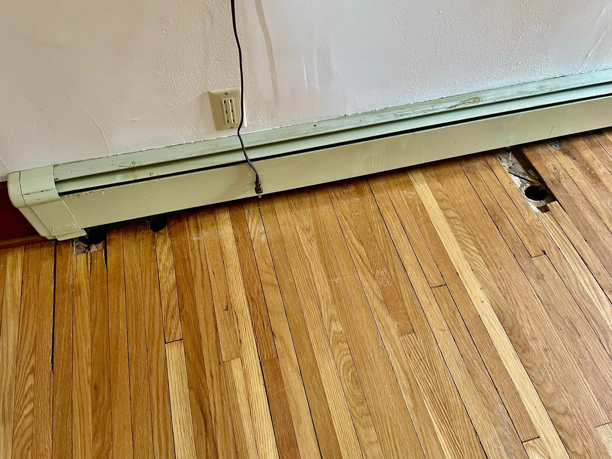 At first glance, the radiator covers were in a pretty sad state. This particular one was actually decent-looking compared to some of the others. I was relieved they were still in working order. You can see where the original old floor radiators used to be with the holes in the floor. I would have loved to replace them with traditional cast iron heaters, but that was out of my budget. Instead, handmade wood covers will replace the existing aluminum ones. Now as for the floor, that was an entirely other matter.